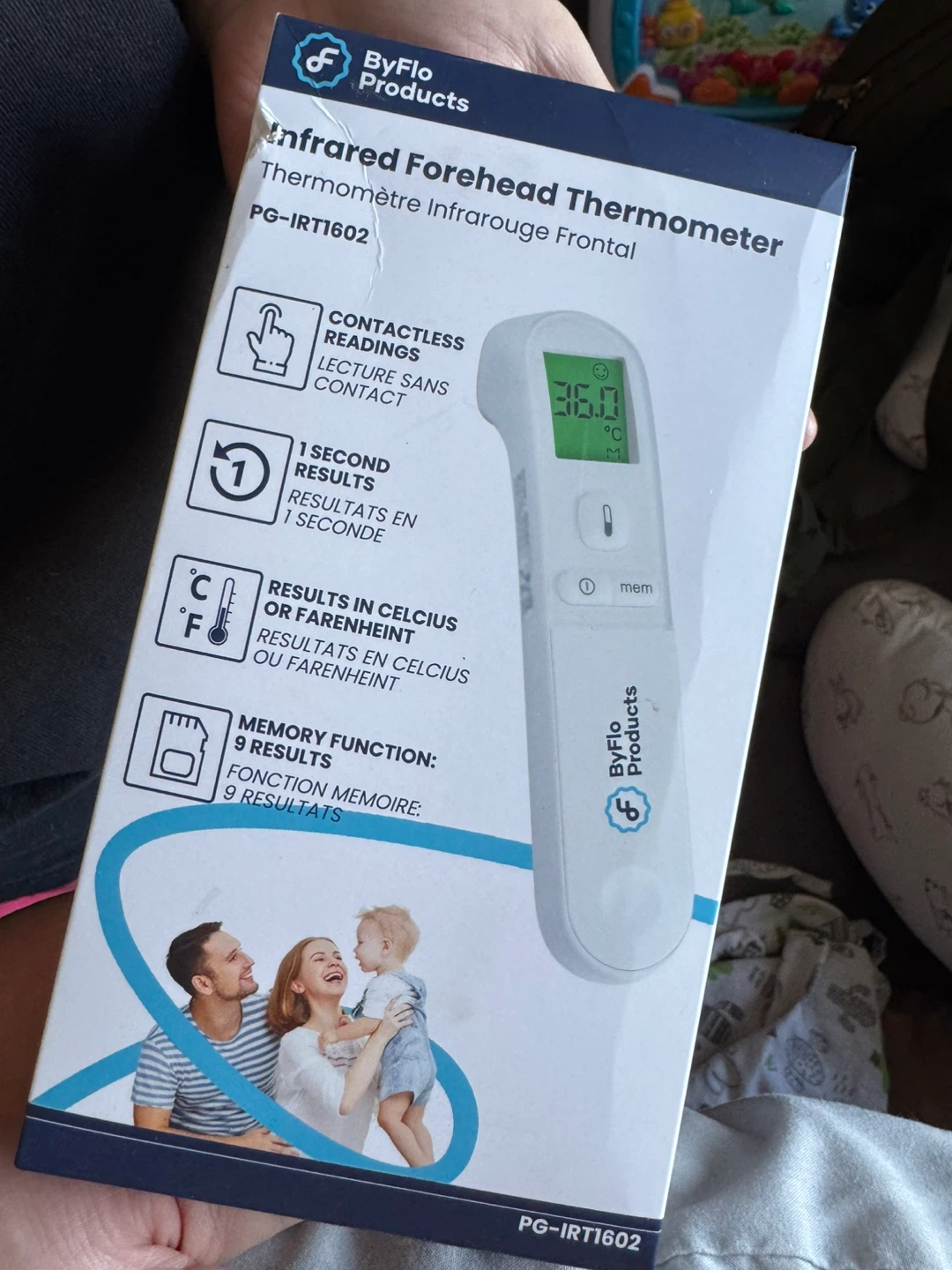 ByFlo Products infrared forehead thermometer. Contactless readings in 1 second. Results in Celsius or Fahrenheit. Memory function stores 9 results.