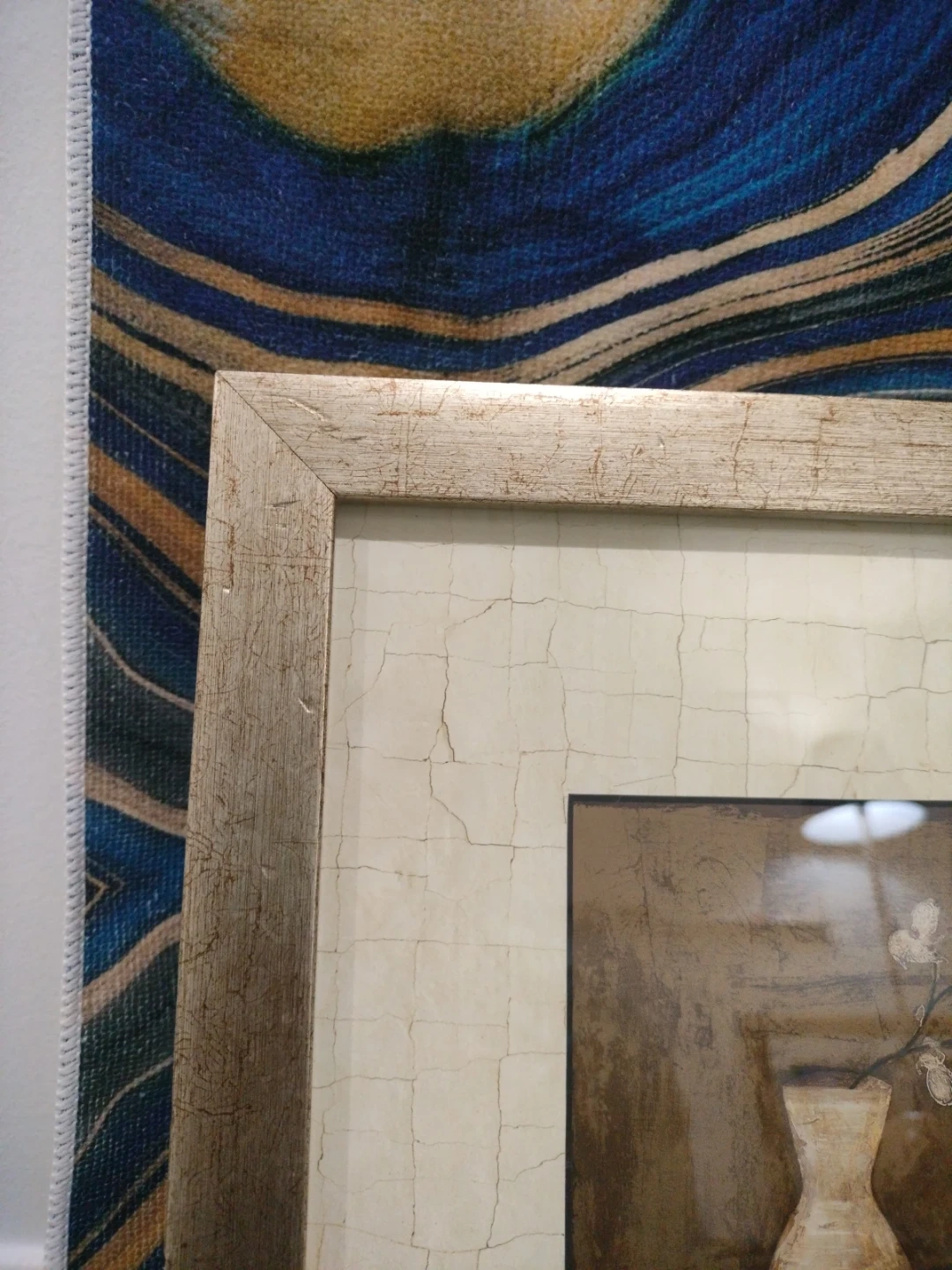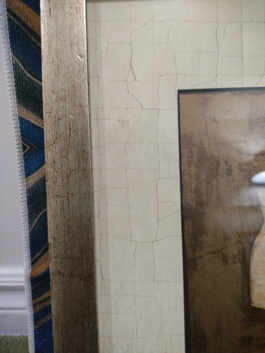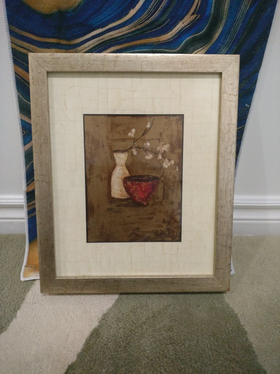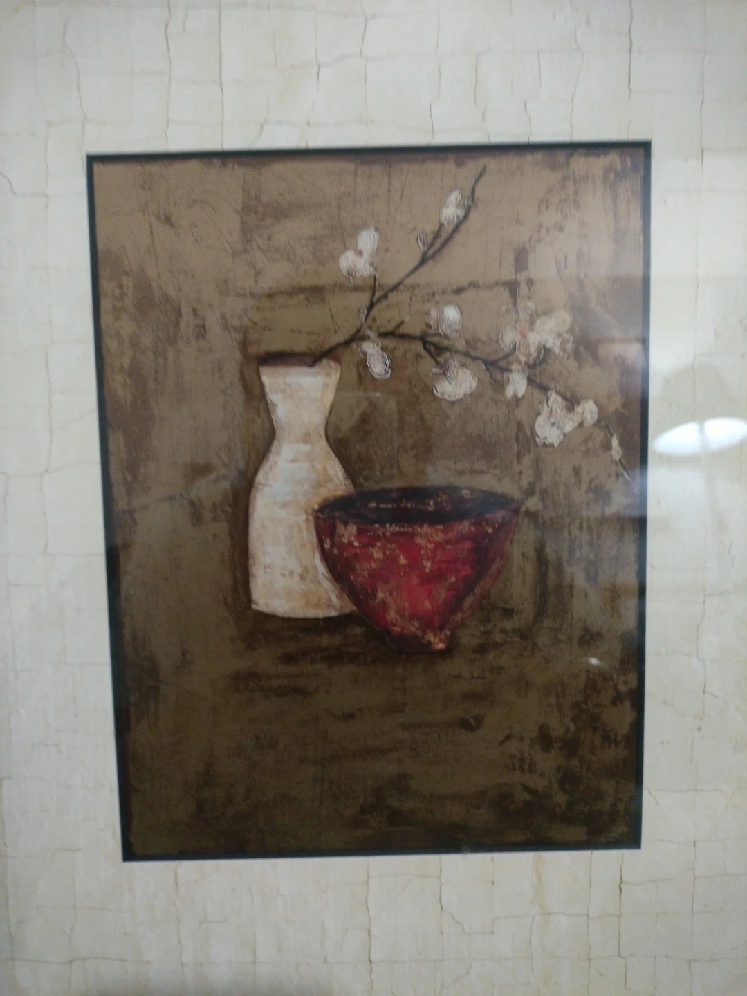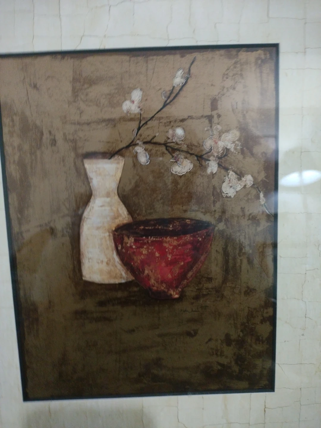 Framed art print featuring a still life of a white vase and a red bowl with a branch of white flowers. The print has a textured, crackled matte surrounding the artwork. It's ready to hang and would add a decorative touch to any room.