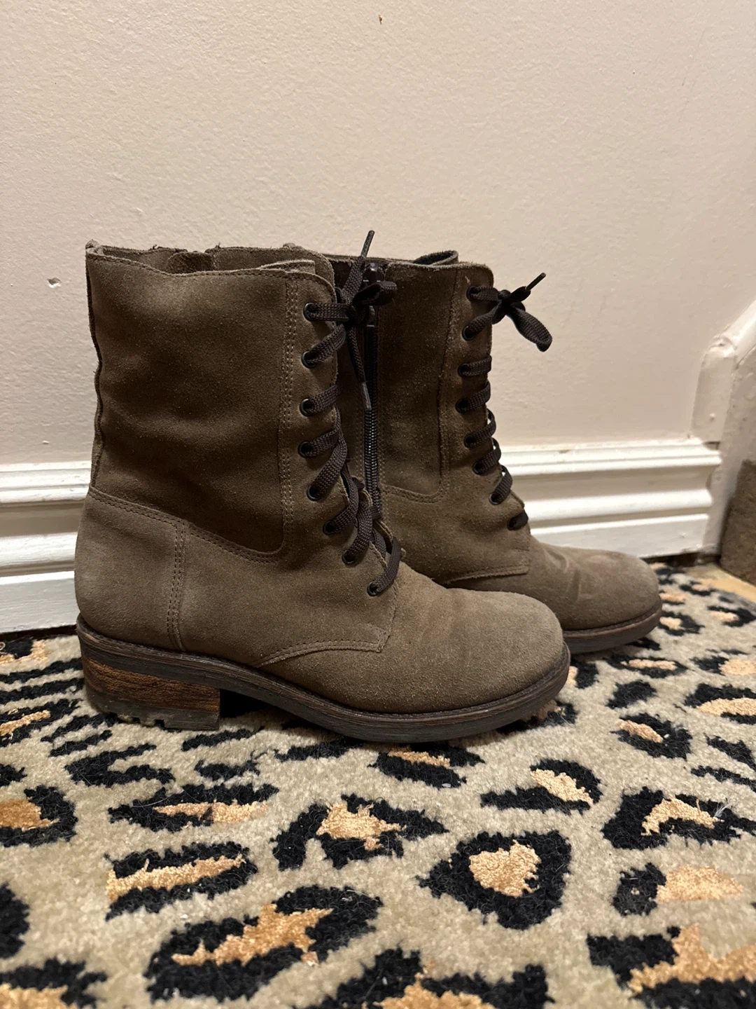 Brown suede lace-up boots with side zipper. These boots are stylish and practical. Made in Montreal.