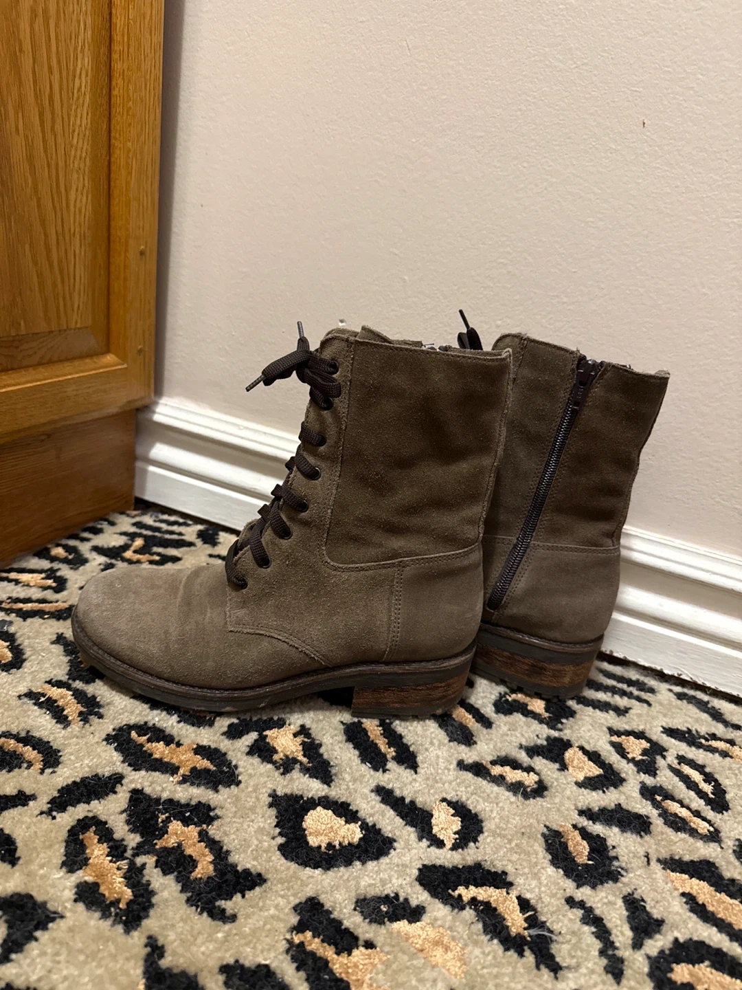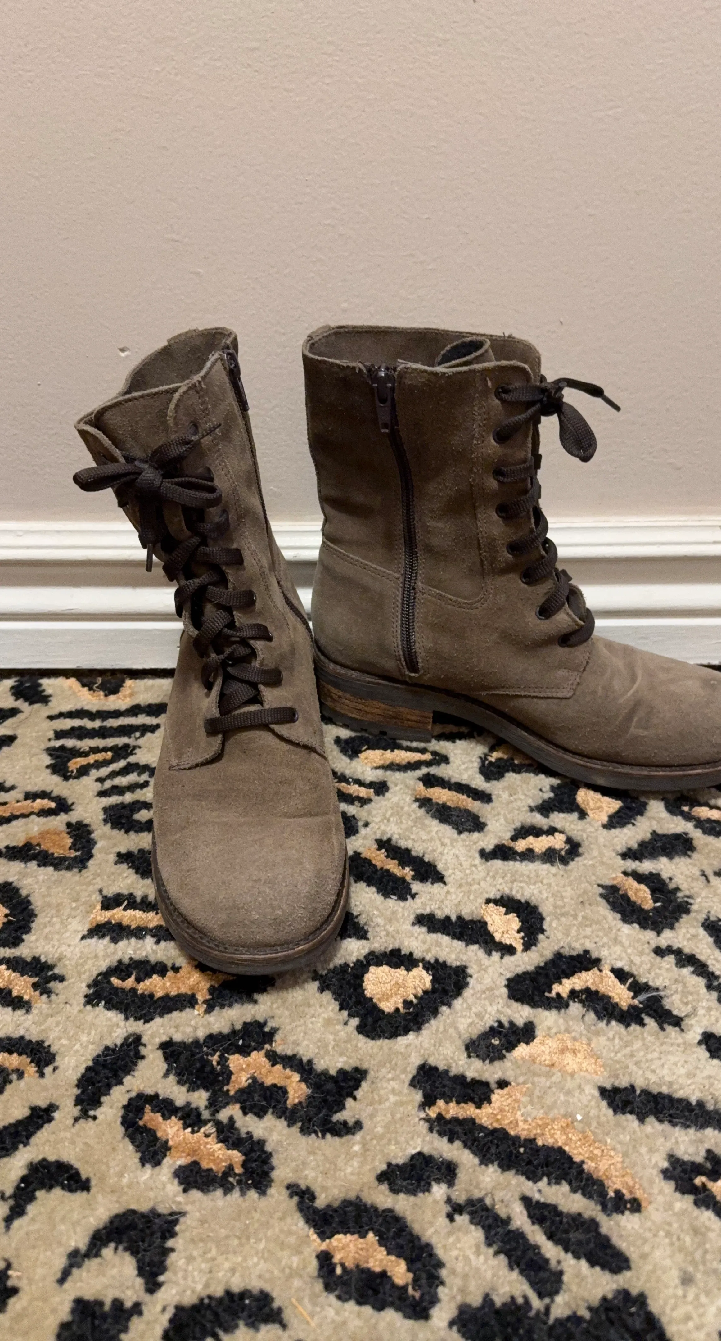 Brown suede lace-up boots with side zipper. These boots are stylish and practical. Made in Montreal.