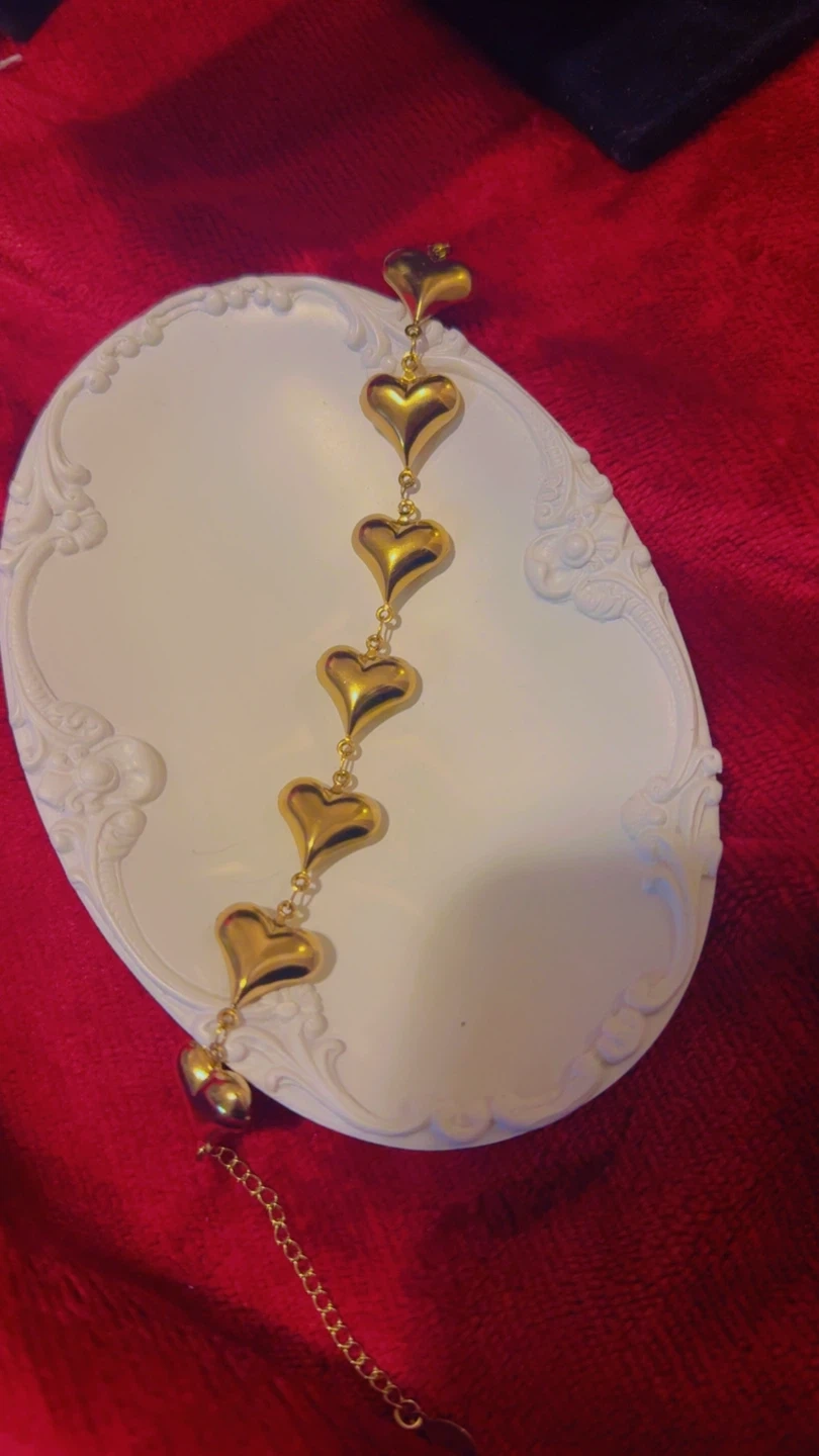 A lovely gold-tone bracelet featuring a chain of puffy heart charms. It's a delicate accessory that adds a touch of sweetness to any outfit. The bracelet has an adjustable clasp for a comfortable fit.