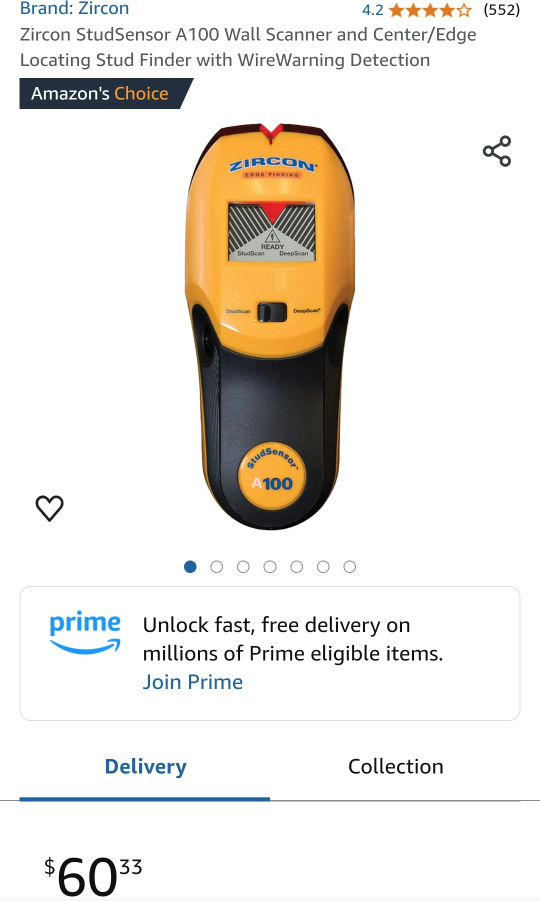 Zircon StudSensor A100 Wall Scanner and Locating Stud Finder