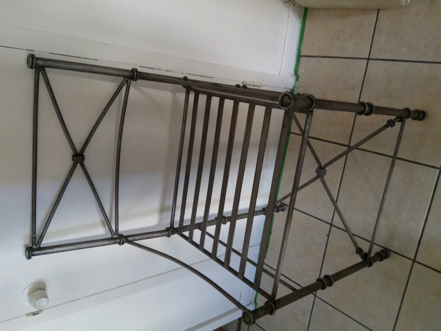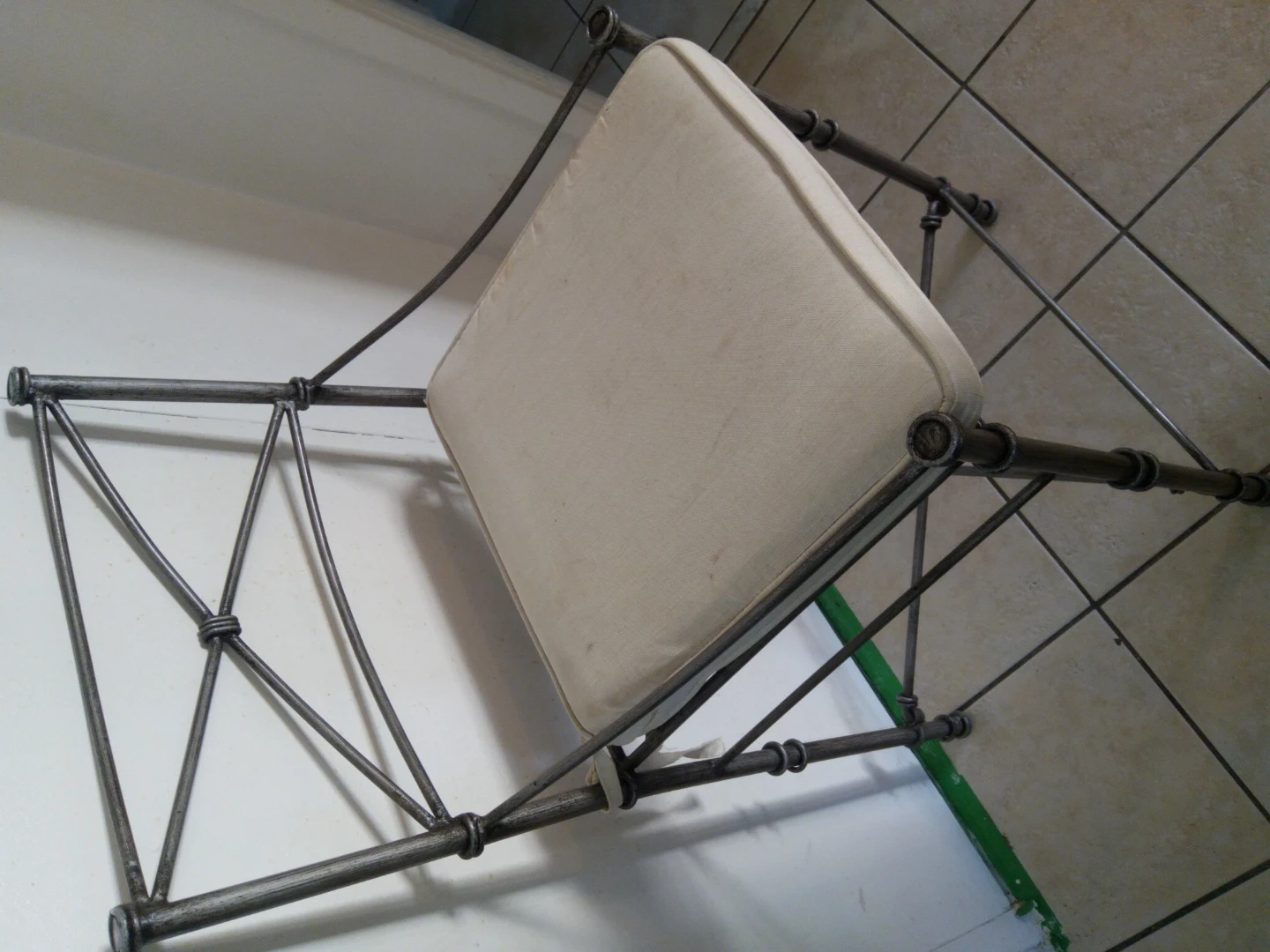 Metal accent chair featuring a decorative back and a cream-coloured upholstered seat. It's made of metal with a distressed finish. This chair would be a nice addition to an entryway or a reading nook. Needs new cushions. 35 each