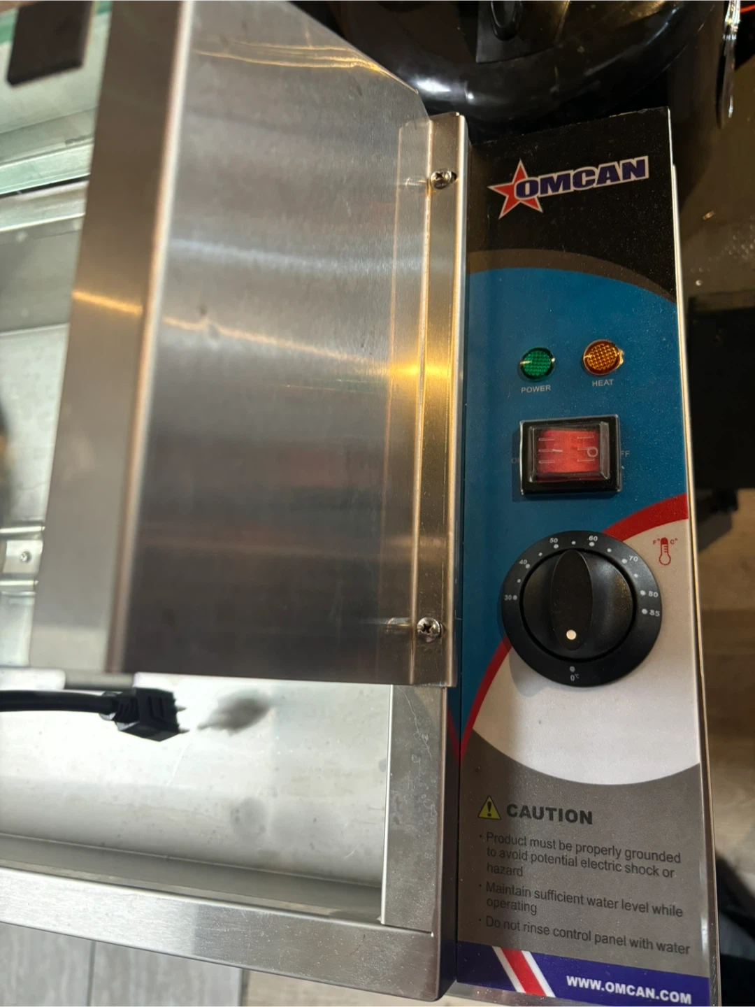 OMCAN electric bain marie, model TB-4. This unit has a voltage of 110V and a power of 1.5kW. Its size is 1210x370x320mm. Production date is 2024 07. Perfect for keeping food warm in a commercial setting!