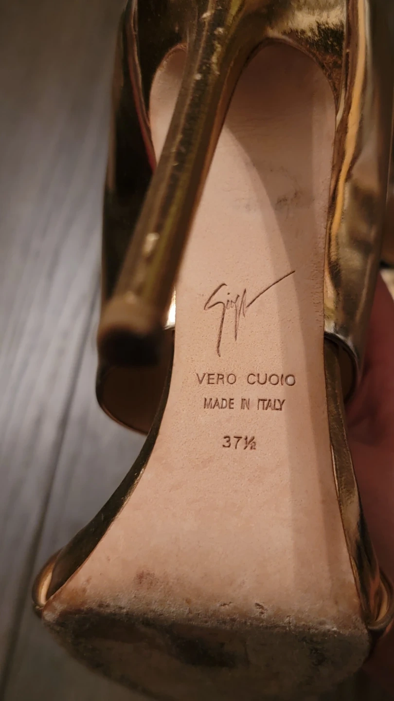 Stylish Giuseppe Zanotti heels in a shiny gold metallic finish. Genuine leather sole, made in Italy. Size is 37.5.