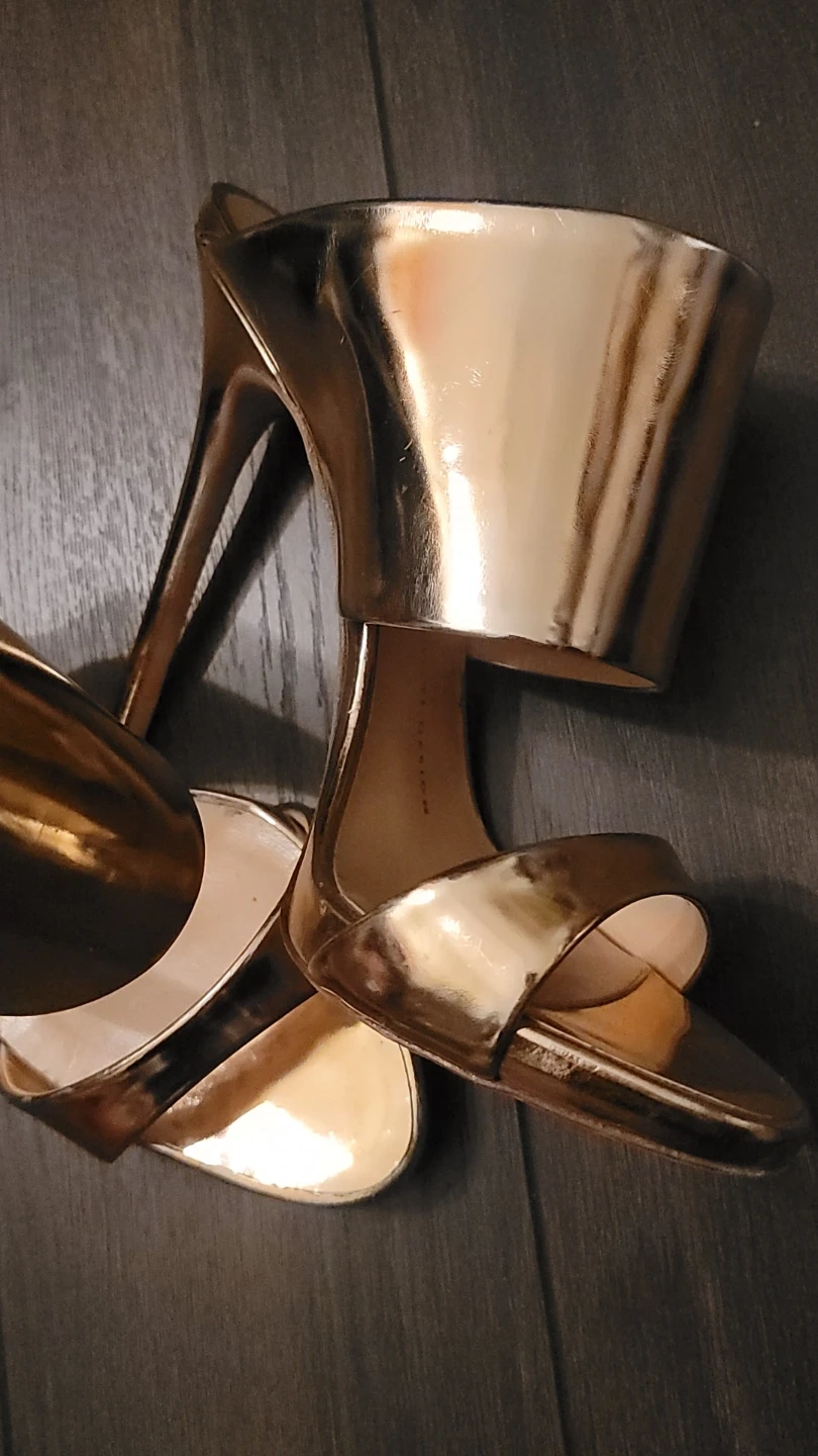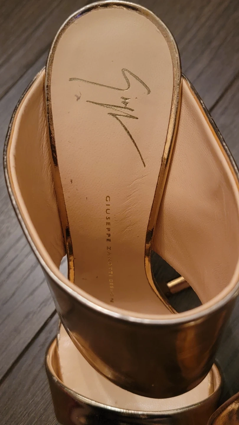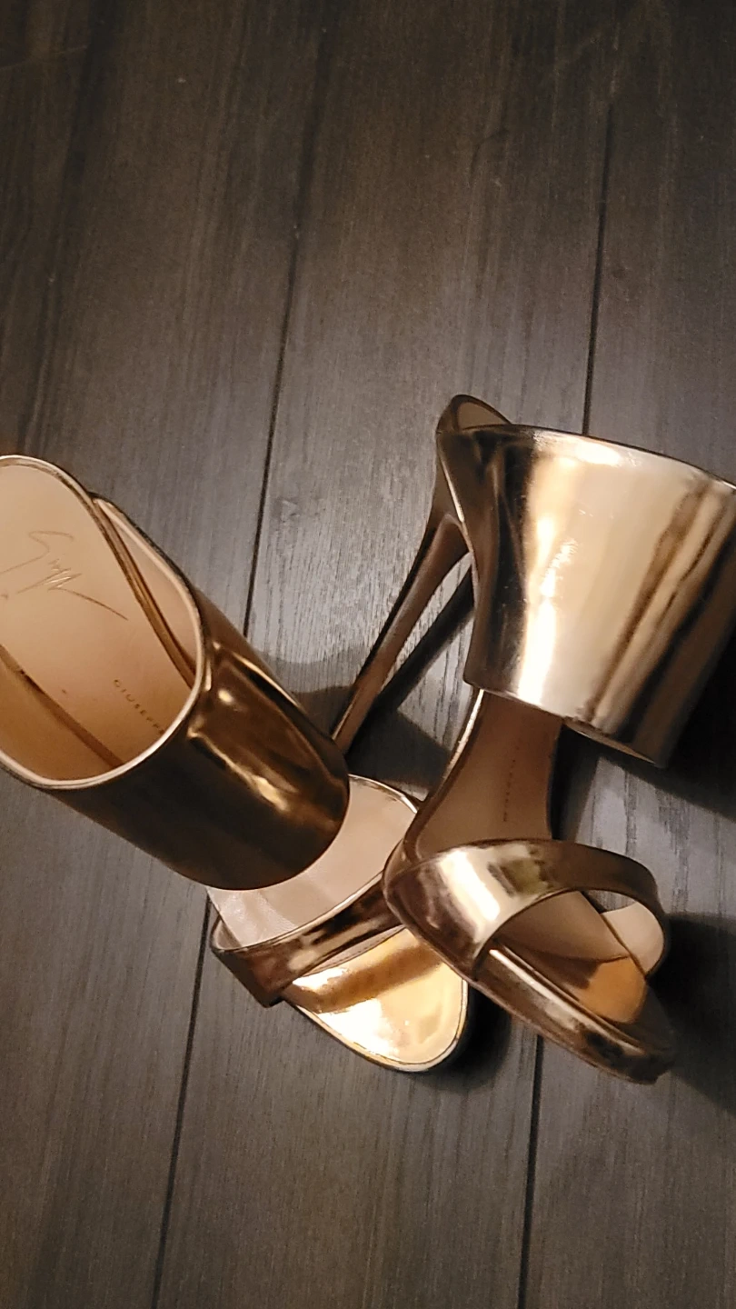 Stylish Giuseppe Zanotti heels in a shiny gold metallic finish. Genuine leather sole, made in Italy. Size is 37.5.