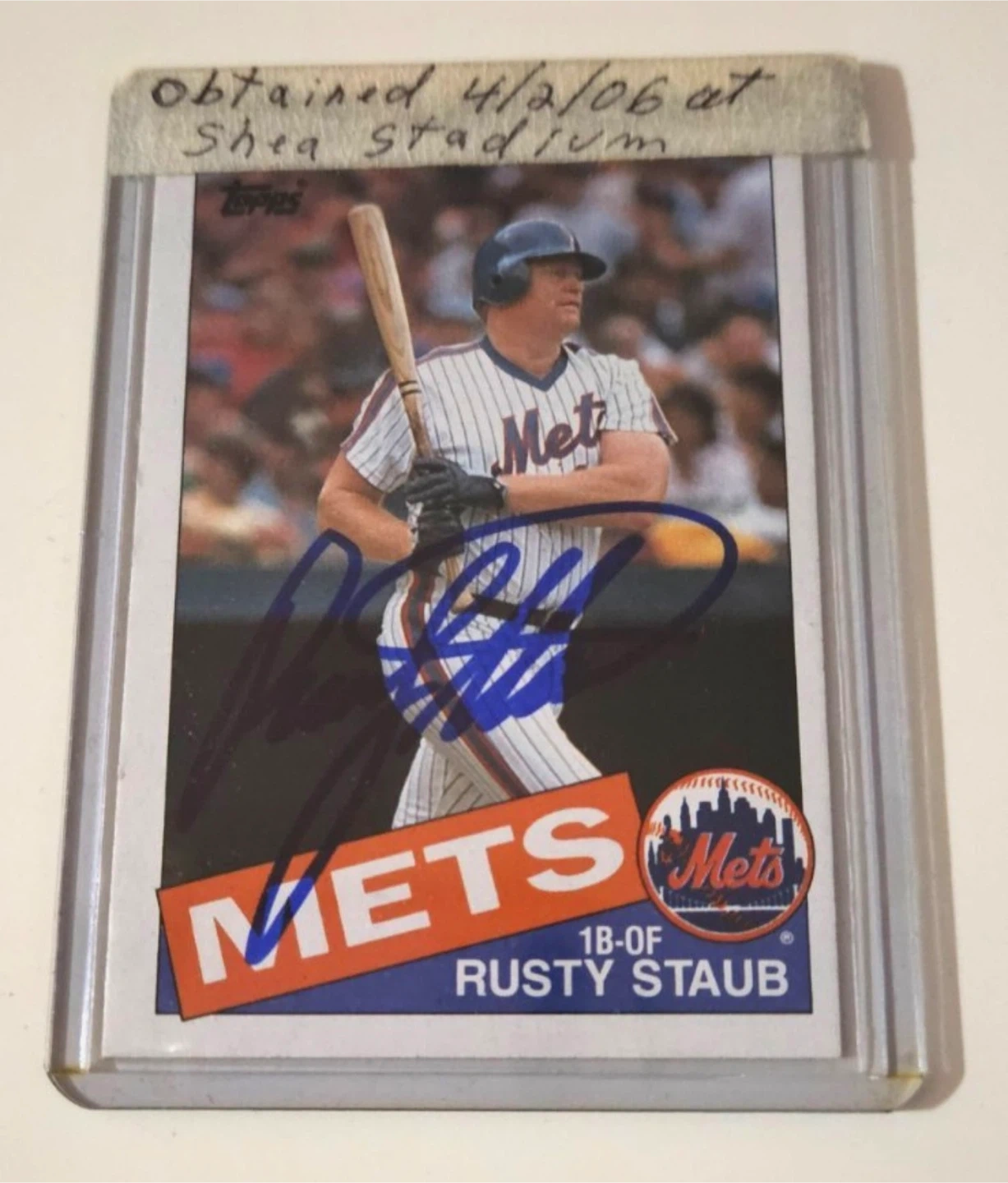 The item is a 1985 Topps Baseball trading card featuring Rusty Staub of the New York Mets, autographed by Staub himself. This vintage collectible is an original card from Topps, made of 20 Pt. card stock and in English language. It is a standard-sized sports trading card from the Major League Baseball (MLB) season of 1985, representing the New York Mets team. This autographed Rusty Staub card is a unique and valuable piece for fans and collectors of sports memorabilia.