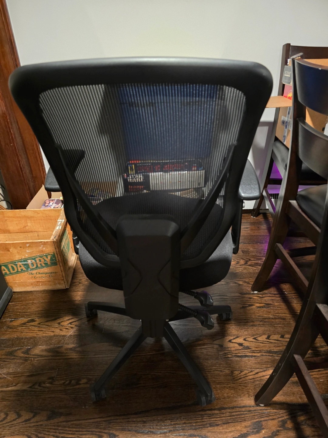 Black office chair. Mesh back and fabric seat. Adjustable height and armrests. Five rolling casters. Good for home or office use.