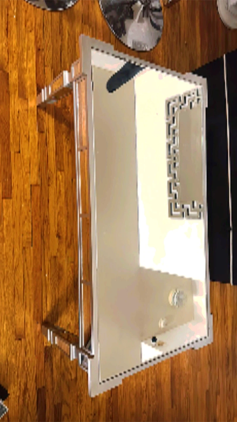 This mirrored coffee table features a sleek, modern design. The top is a smooth, reflective mirrored surface with a decorative geometric border. It's supported by a metallic frame with a layered, architectural style base.