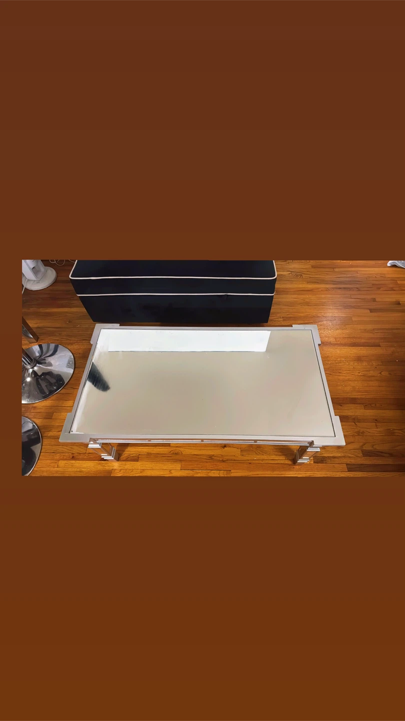 This mirrored coffee table features a sleek, modern design. The top is a smooth, reflective mirrored surface with a decorative geometric border. It's supported by a metallic frame with a layered, architectural style base.