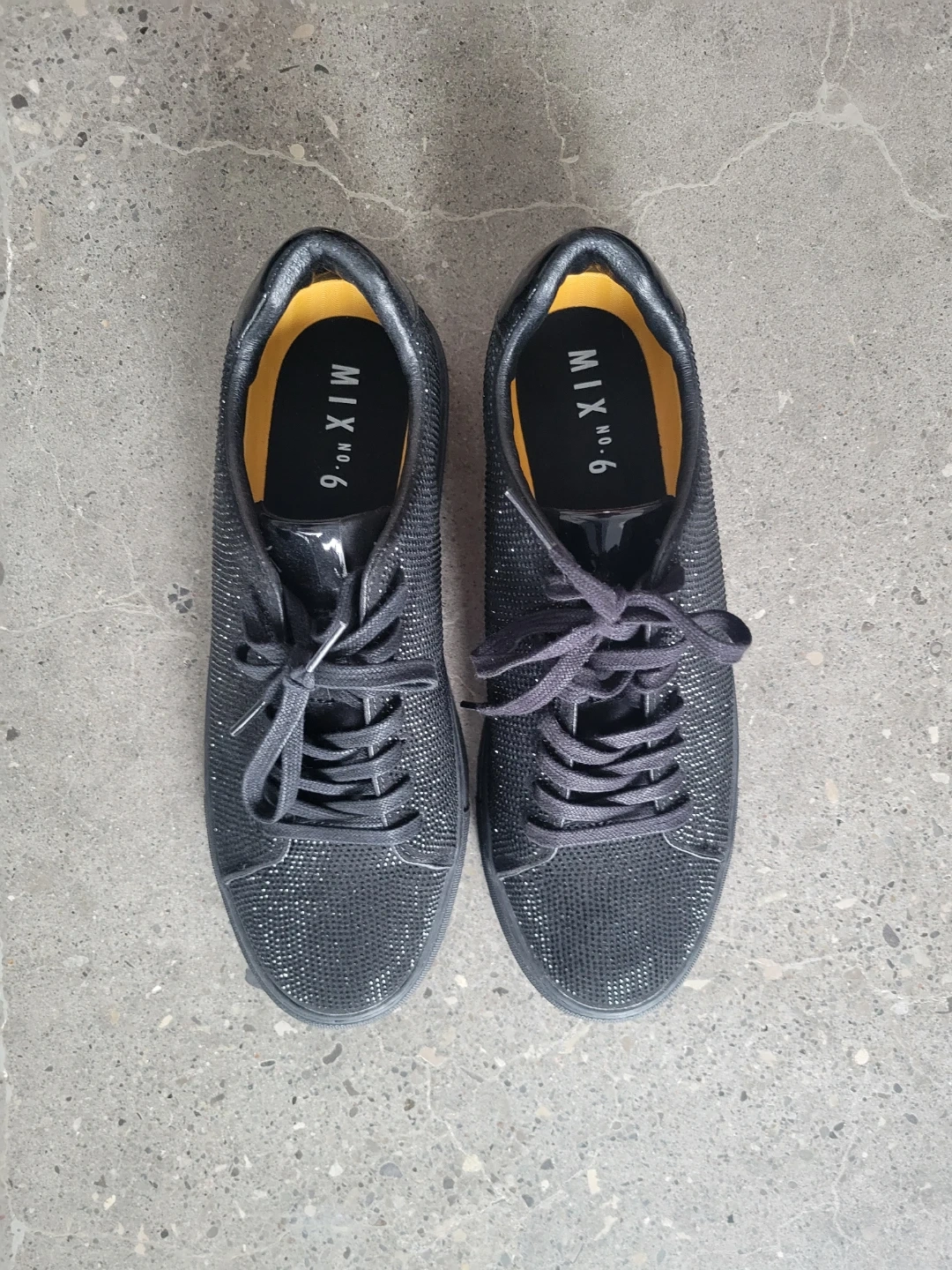 These MIX NO. 6 mens sneakers feature a dazzling black rhinestone upper. They have a lace-up closure and a comfortable, solid sole.