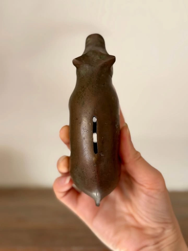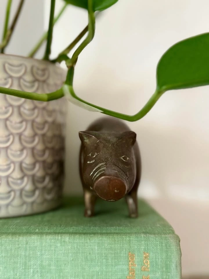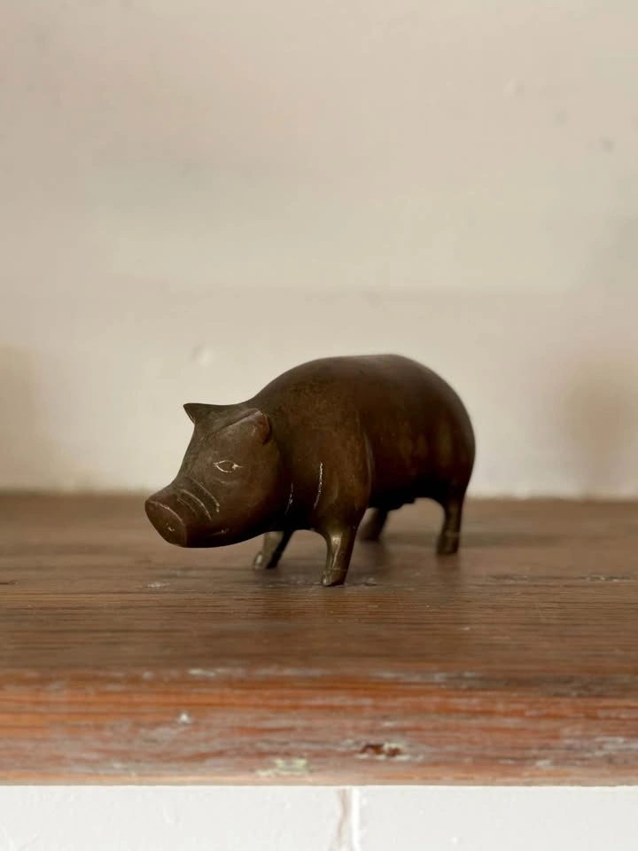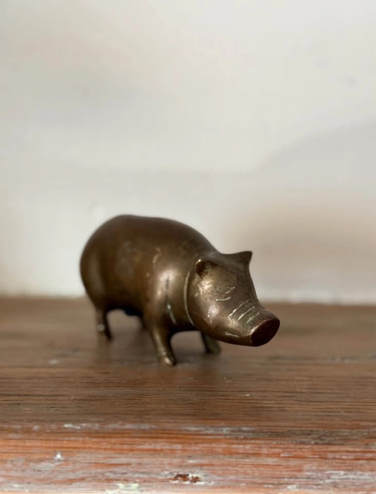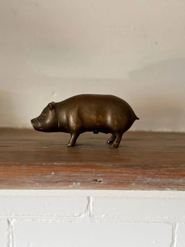 Solid brass pig coin bank. This heavy, aged brass piece features a beautiful natural patina and a classic minimalist silhouette.