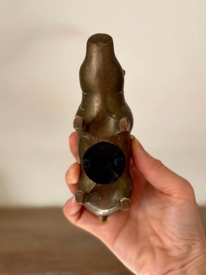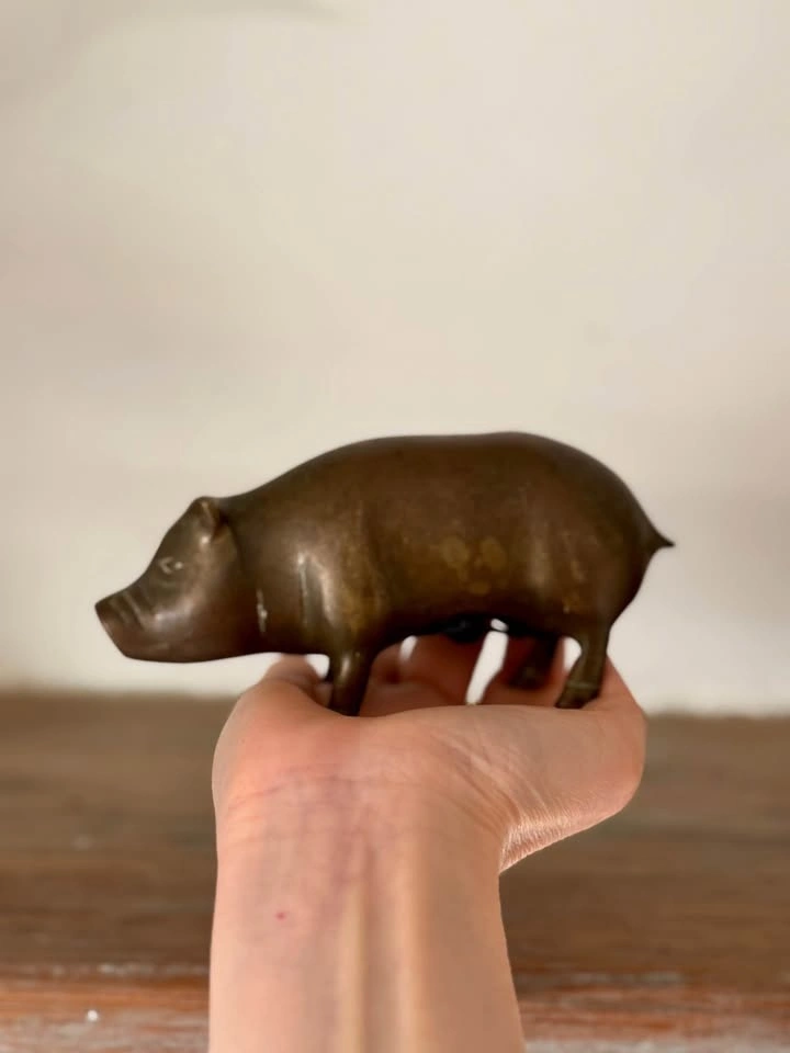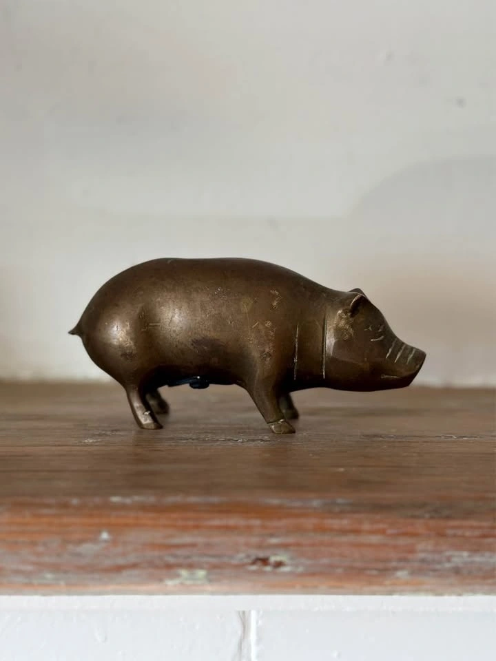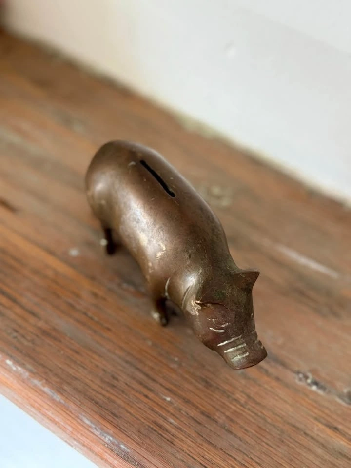 Solid brass pig coin bank. This heavy, aged brass piece features a beautiful natural patina and a classic minimalist silhouette.