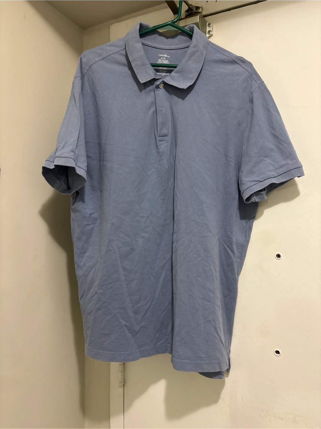 A simple blue polo shirt from George. It's made of a cotton blend and features a classic collar with a two-button placket. Short sleeves with a finished hem. This shirt is suitable for casual wear.