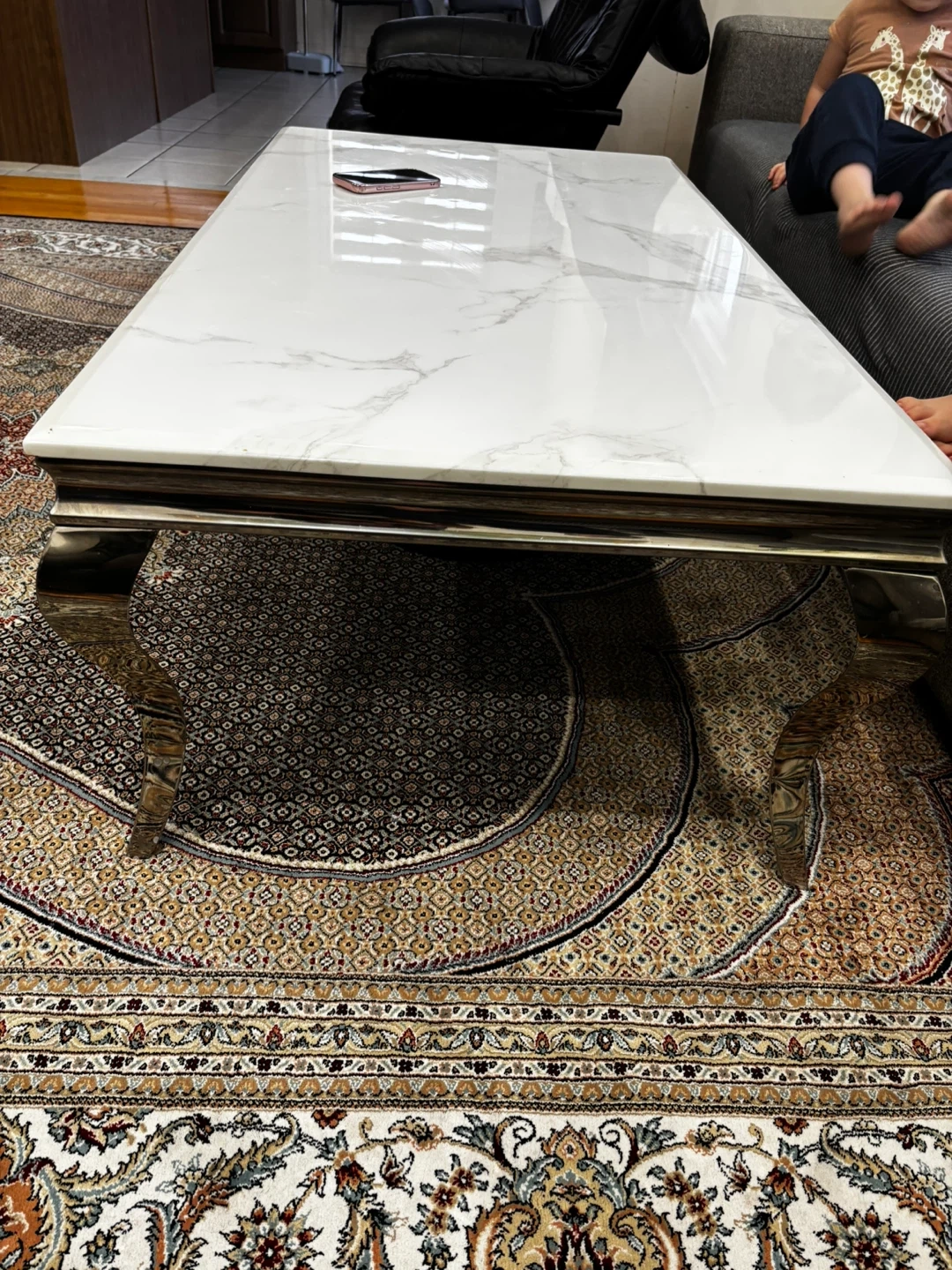 This rectangular coffee table features a stylish white marble-look top and a polished chrome frame. It's a sleek addition to any living room. The tabletop is made of a durable, easy-to-clean material. It offers ample surface area for drinks, books, or decor.