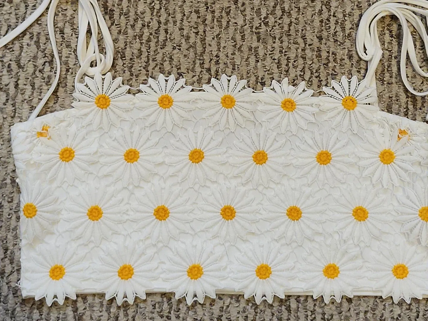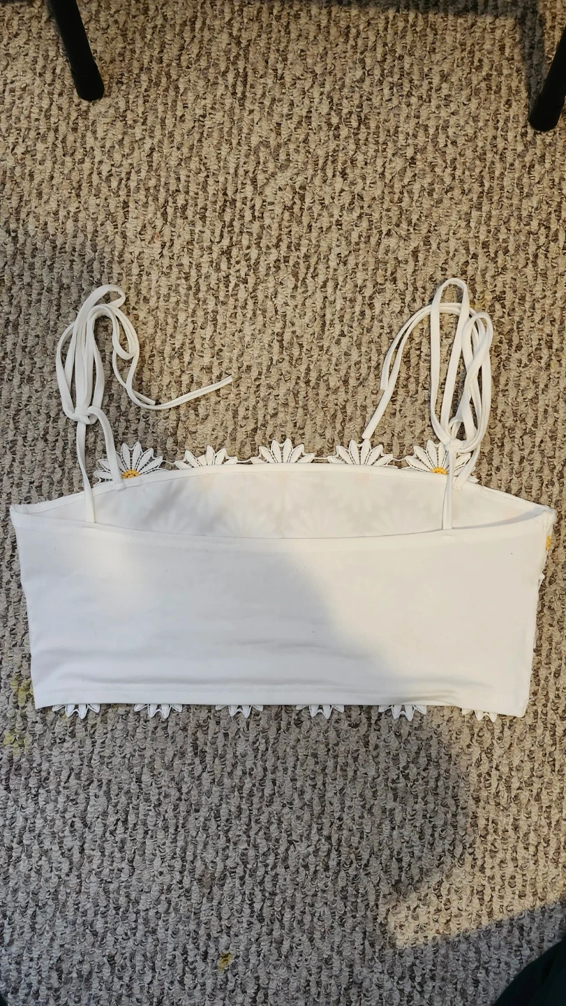 This white crop top features a delicate daisy floral appliqué all over. It has adjustable tie straps for a custom fit. It's a fun and flirty piece perfect for warm weather!