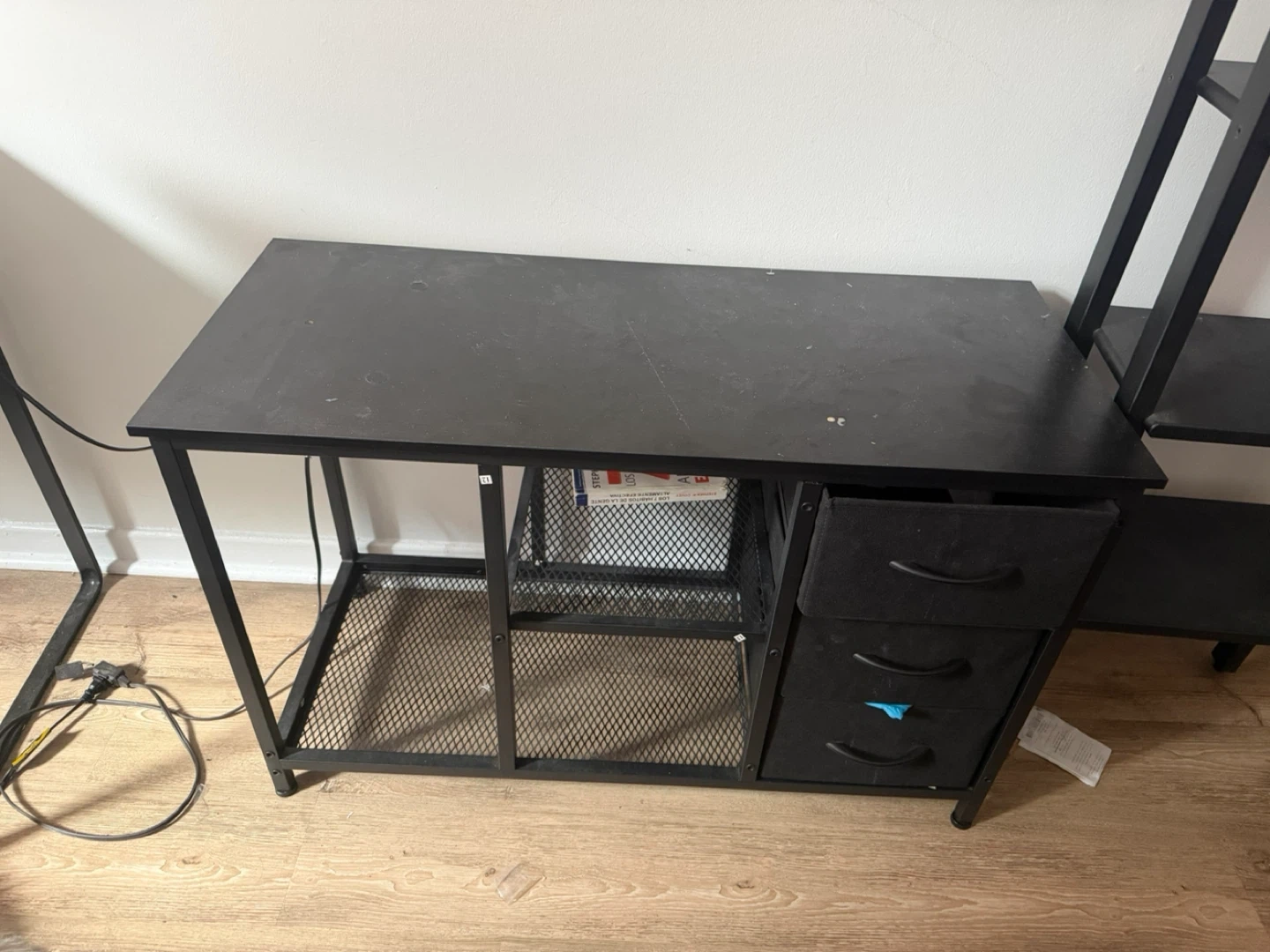 This black computer desk has a sturdy metal frame and a spacious desktop. It includes three fabric drawers for storage and a mesh shelf underneath. The desk is black and has a modern design.