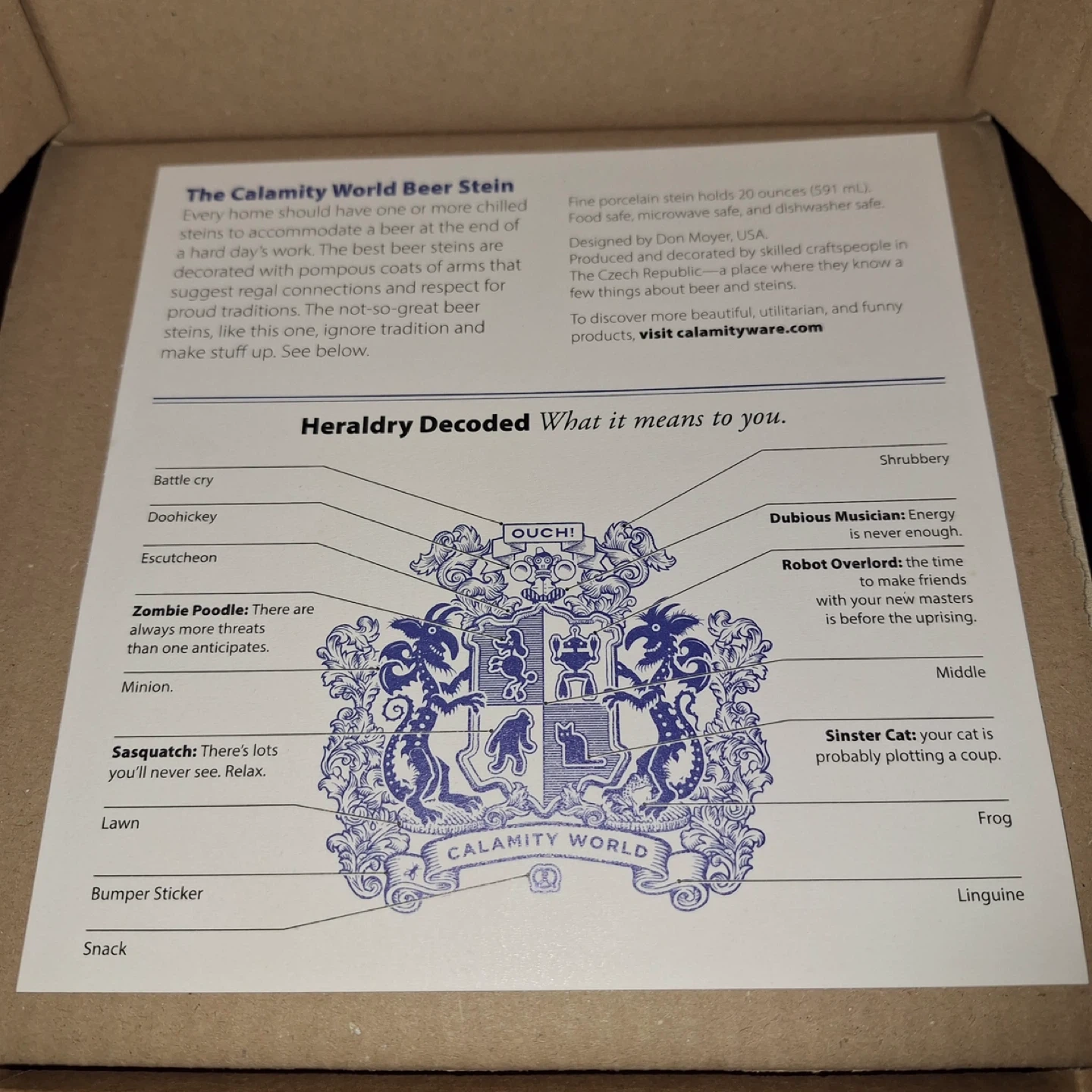 This beer stein holds 20 ounces (591 ml). It's made of fine porcelain and is microwave and dishwasher safe. Produced and decorated by skilled craftspeople. Still in original packaging never used