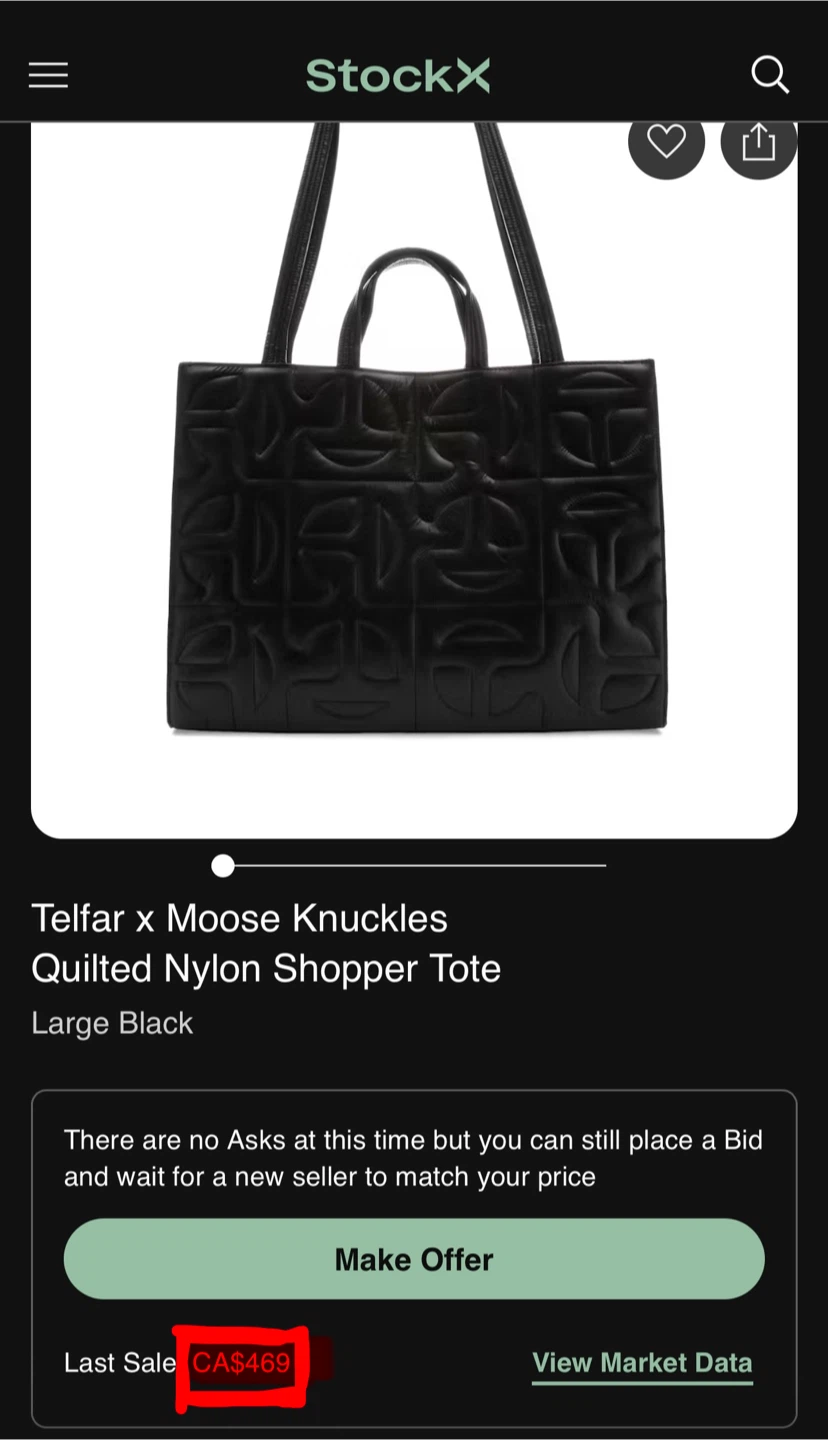 1 / 31 / 3Buy & SellTelfar x Moose Knuckles Quilted Nylon Shopper Tote - Large BlackTelfar x Moose Knuckles Quilted Nylon Shopper Tote - Large Black$315This is the Telfar x Moose Knuckles Quilted Nylon Shopper Tote in large black. It includes a dust bag for storage.WHERE TO MEETBrentwood areaView MapSELLERverifiedKLBrentwood1076 reviews0 chats·0 favorites·22 viewsSEND CHAT TO SELLERHi KL! I’m interested in your listing.Hi KL! I’m interested in your listing.Get the Karrot app to chatSign In to chat