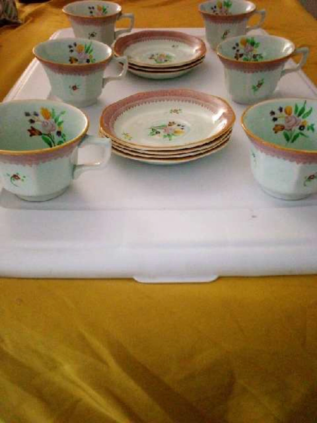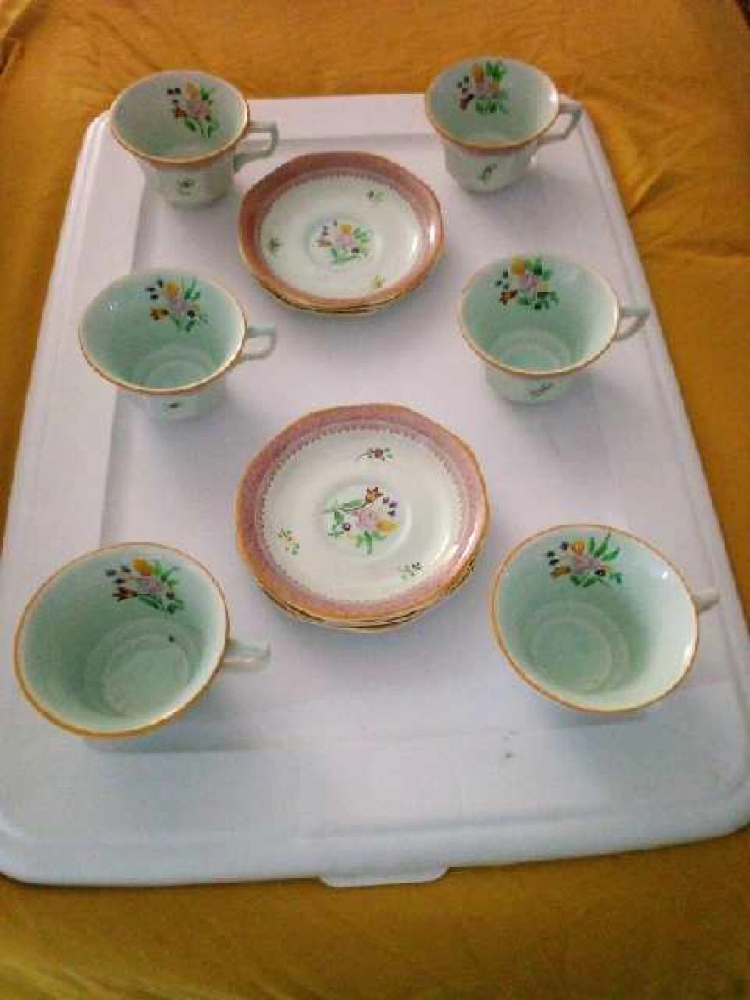 Set of six teacups and saucers. Floral pattern. Pale green and pink colors. Perfect for afternoon tea or a charming addition to your collection.