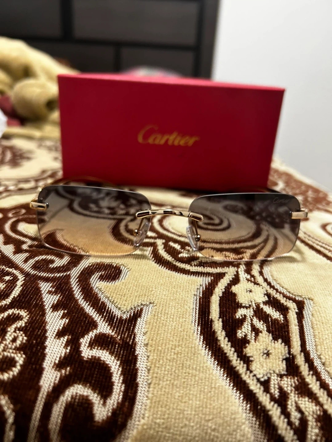 Cartier rimless sunglasses in gold with a panther detail on the temple. Gradient lenses included. Comes with the original red Cartier box.