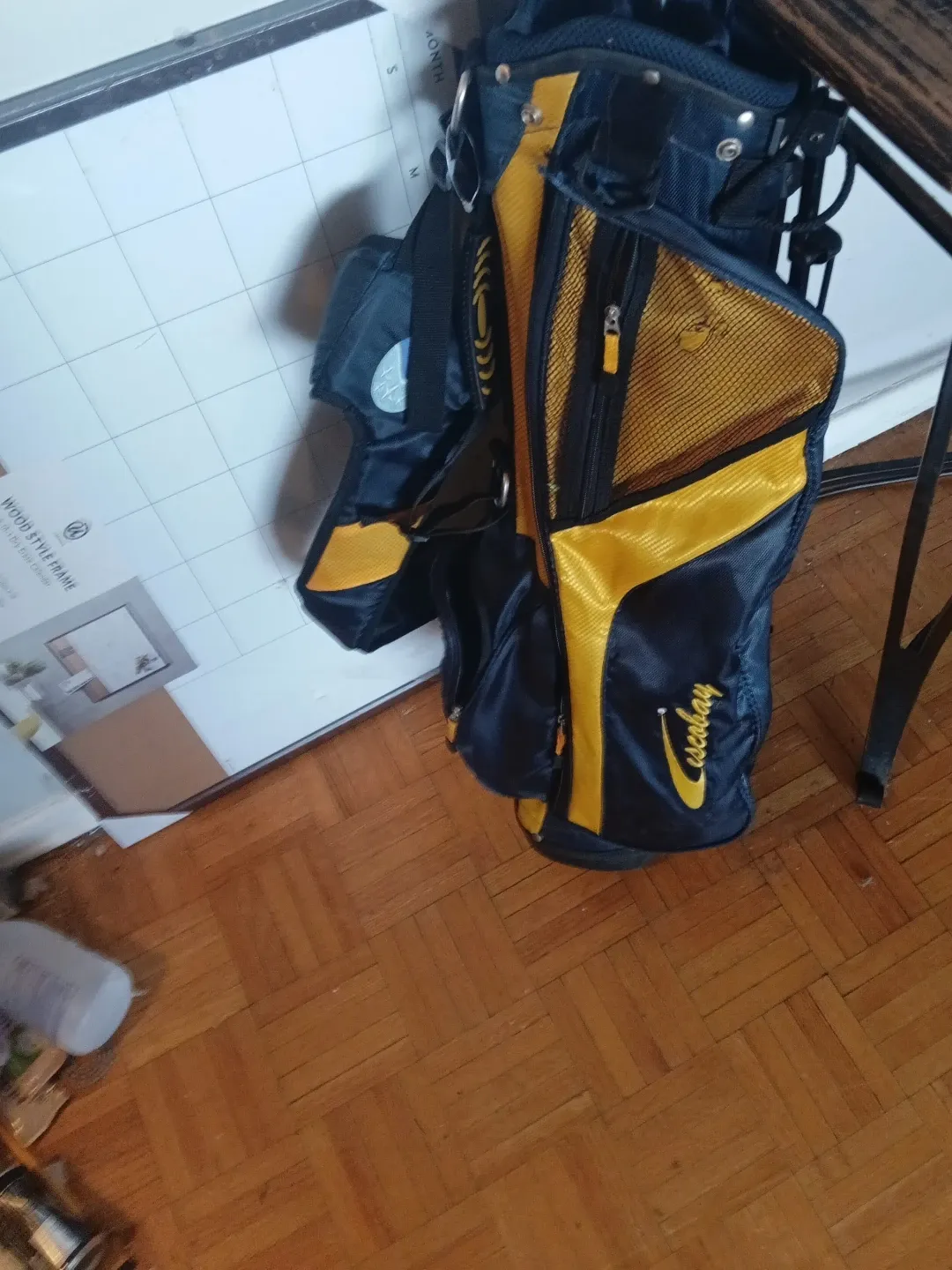 Selling a Callaway golf bag in navy and gold. It's in good condition and ready for the golf course! Has lots of pockets for storage.