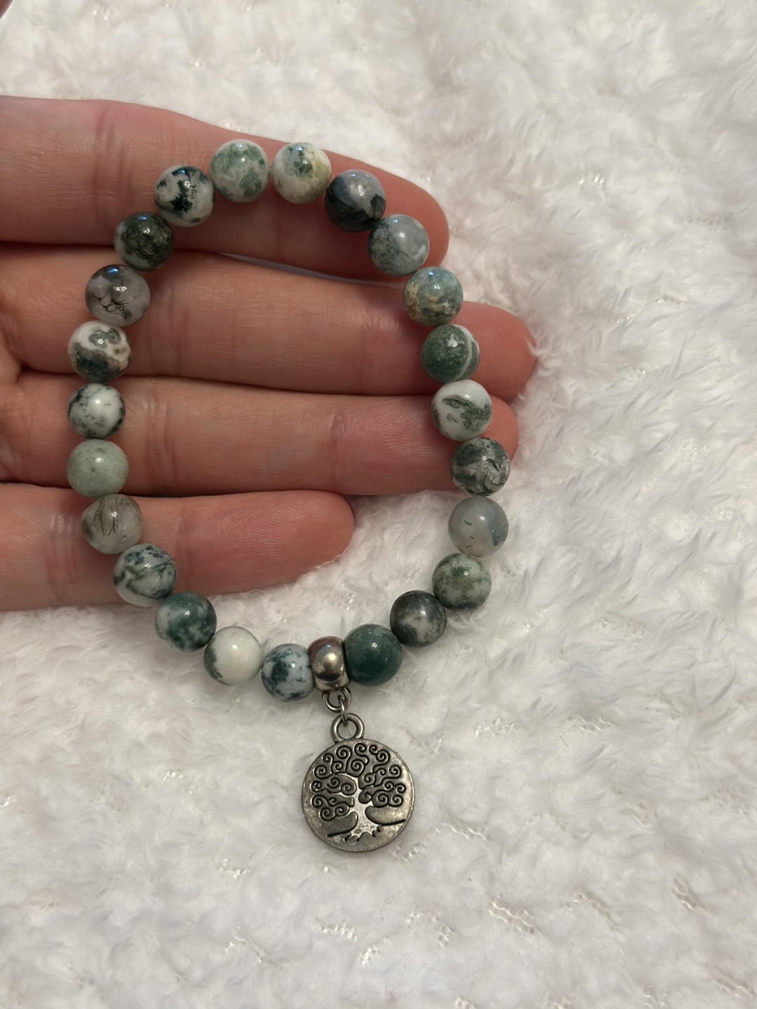 This is a cute beaded bracelet with a tree of life charm. The beads are a mix of green, gray, and white, giving it a natural look. It's in great condition and would make a lovely addition to your jewelry collection