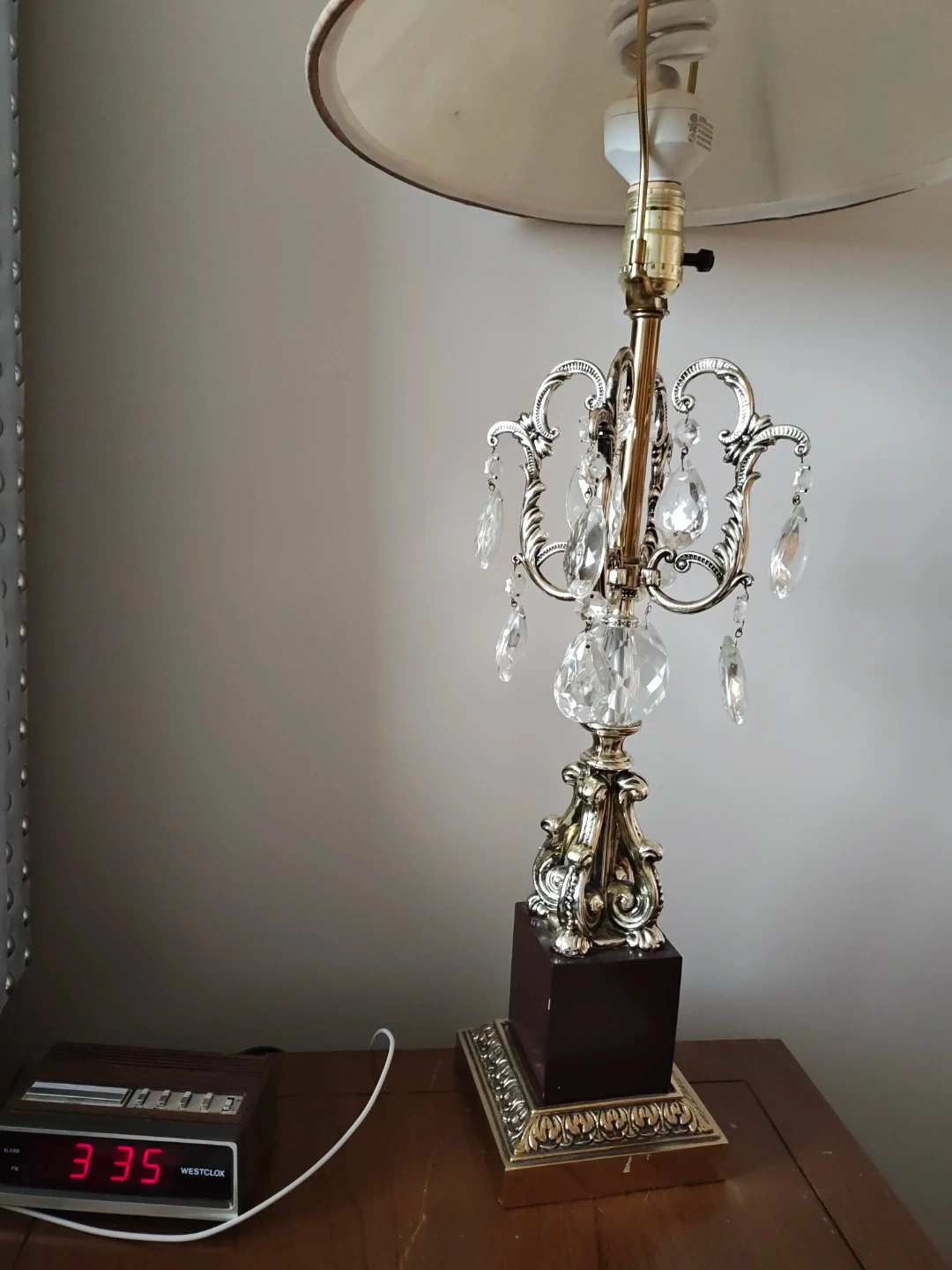 This elegant table lamp features a classic beige lampshade and a decorative crystal accent on its ornate metal base. It's a stylish addition to any room, providing warm ambient lighting. The lamp has a standard bulb socket and a sturdy, decorative base.