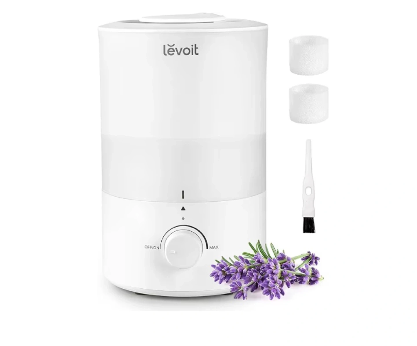 This Levoit humidifier is white and comes with two replacement filters and a cleaning brush. It features an adjustable knob for mist output control, ranging from off to max. It's a great way to add moisture to your space!