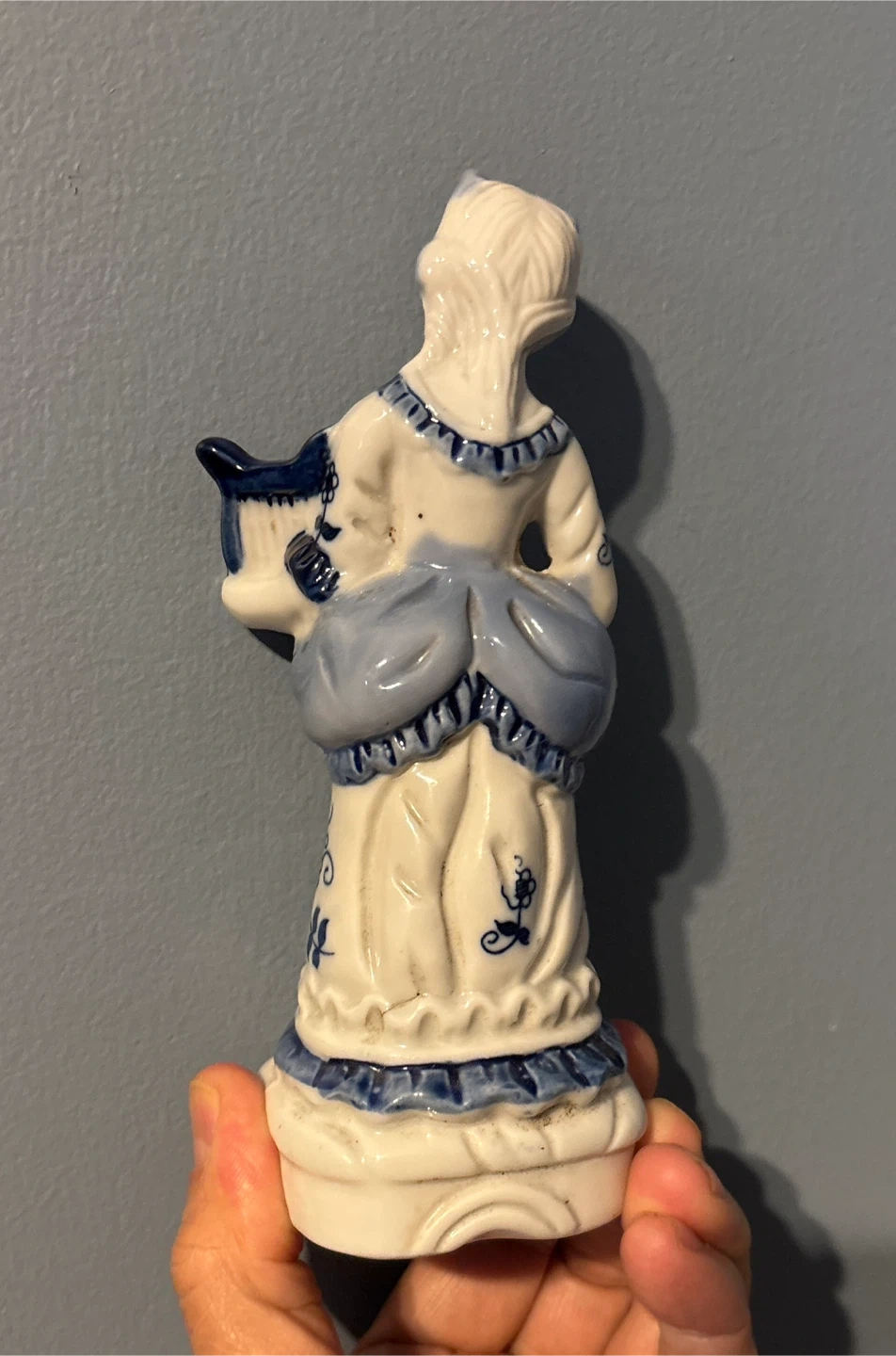 This is a ceramic figurine of a woman holding a lyre (about 6”). It's painted with blue and white detailing. The figurine comes in a decorative box with a snowman design.