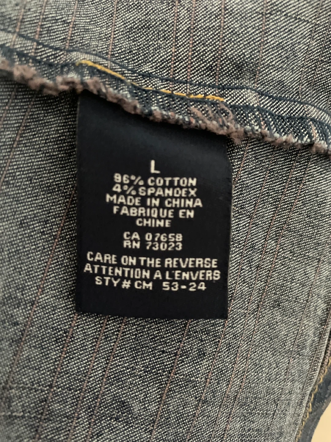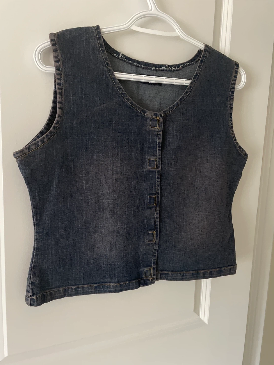 This is a Bongo denim vest. It's made of 96% cotton and 4% spandex. The vest has a button-up front. It's a great layering piece for your wardrobe!