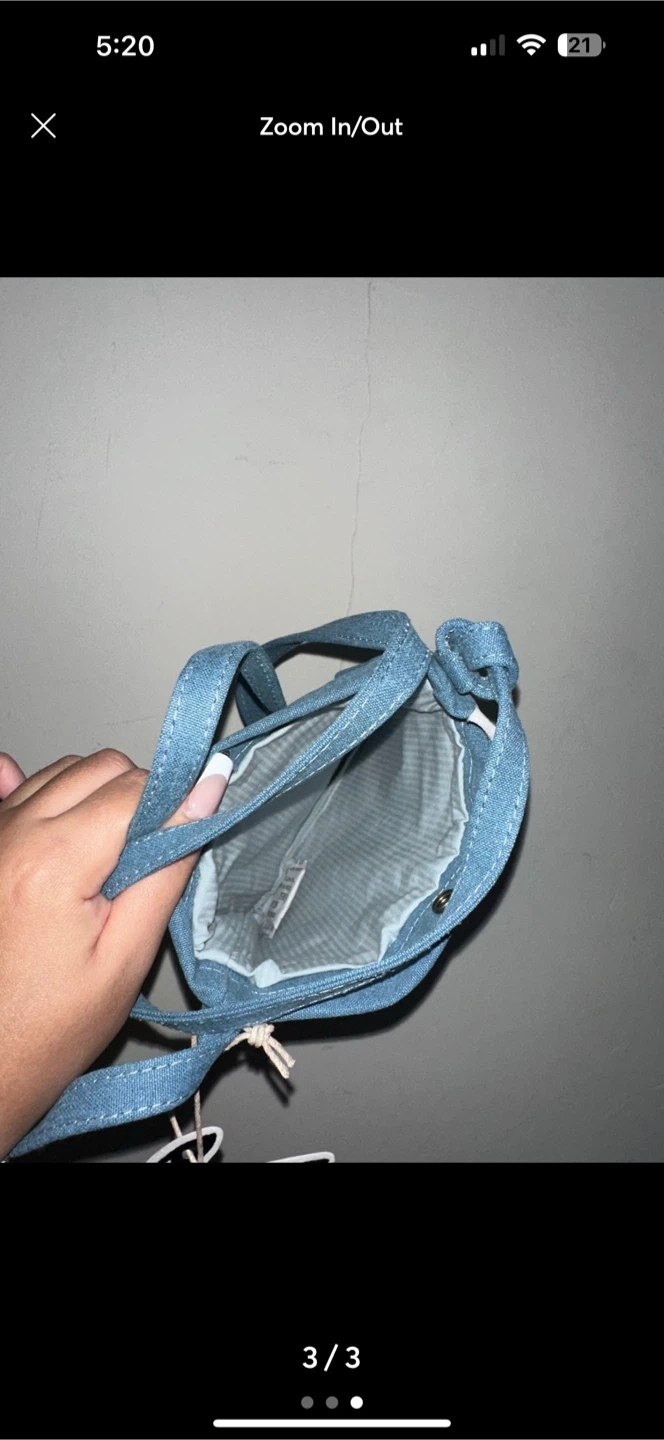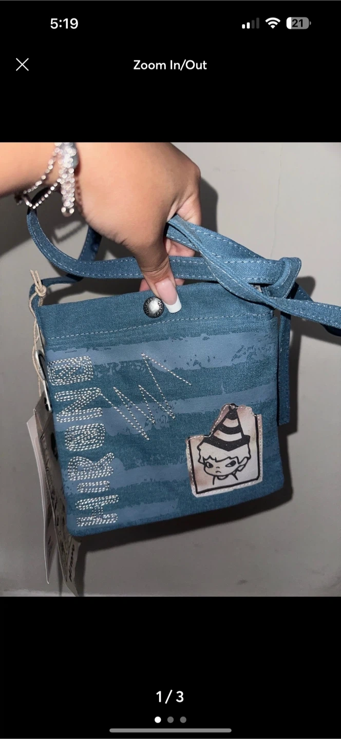 This is a Living Well crossbody bag in a nice blue color. It's perfect for carrying your essentials while keeping your hands free. It features a cute design and is in great condition!