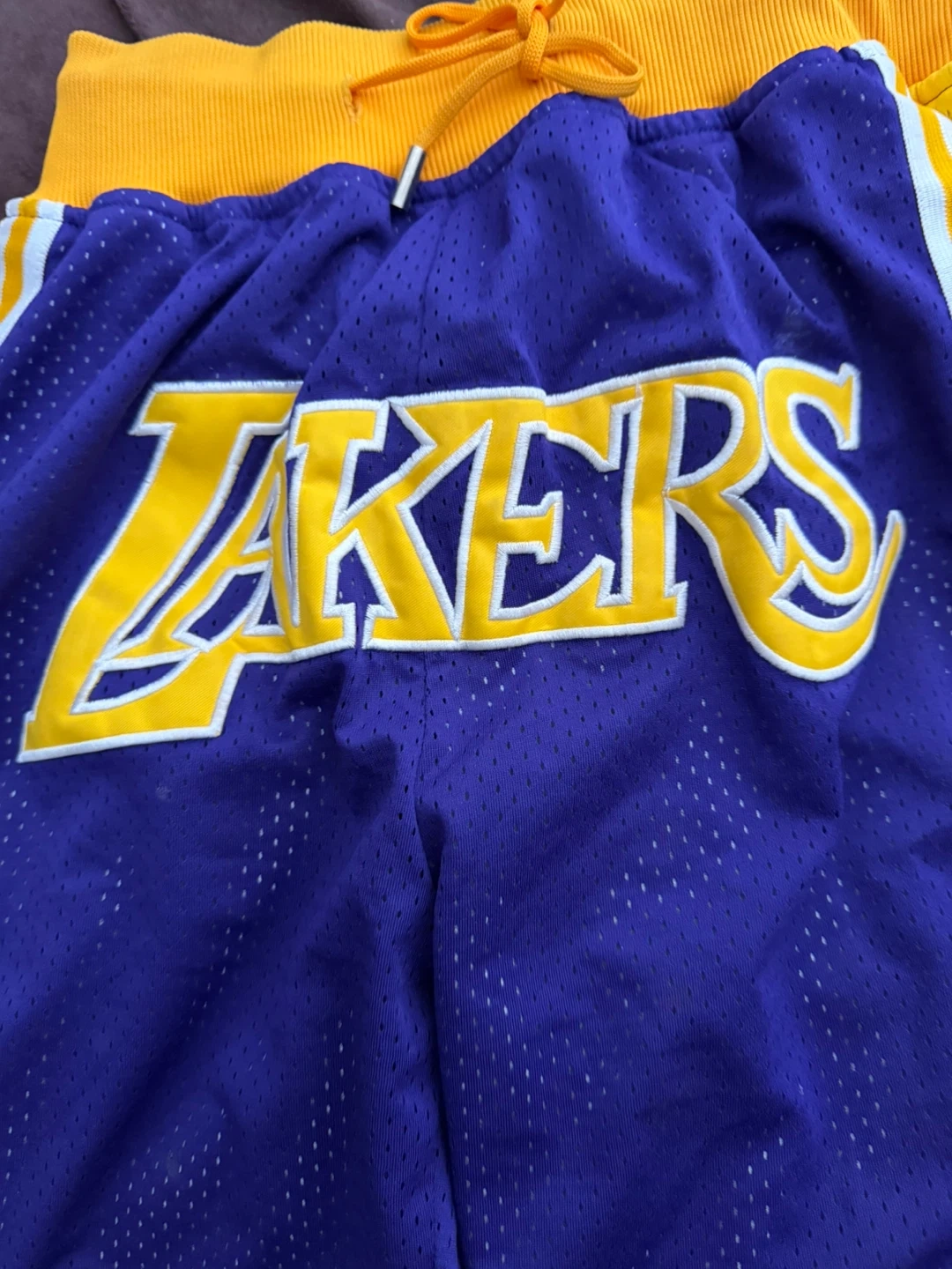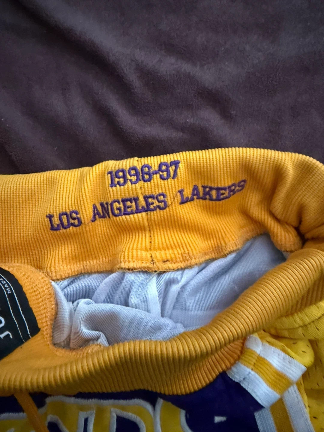 These shorts are branded with the Los Angeles Lakers logo and "1996-97" detailing. They feature a mesh fabric with purple and yellow colouring and a drawstring waist. It's a piece for any basketball fan!