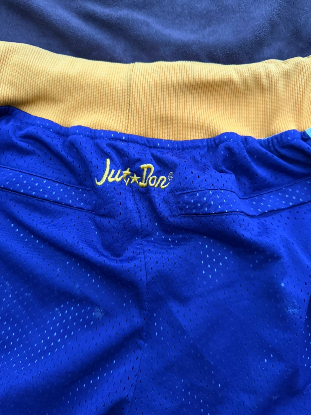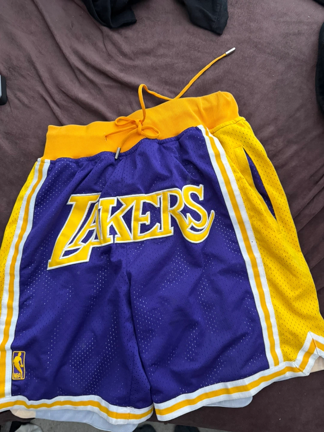 These shorts are branded with the Los Angeles Lakers logo and "1996-97" detailing. They feature a mesh fabric with purple and yellow colouring and a drawstring waist. It's a piece for any basketball fan!