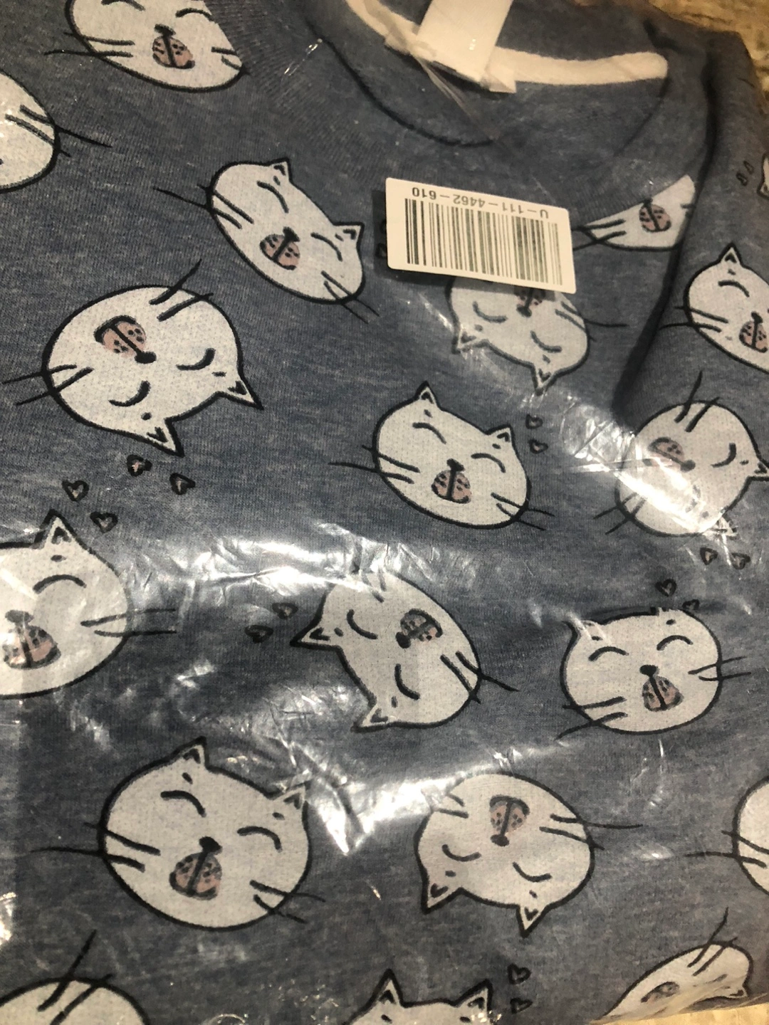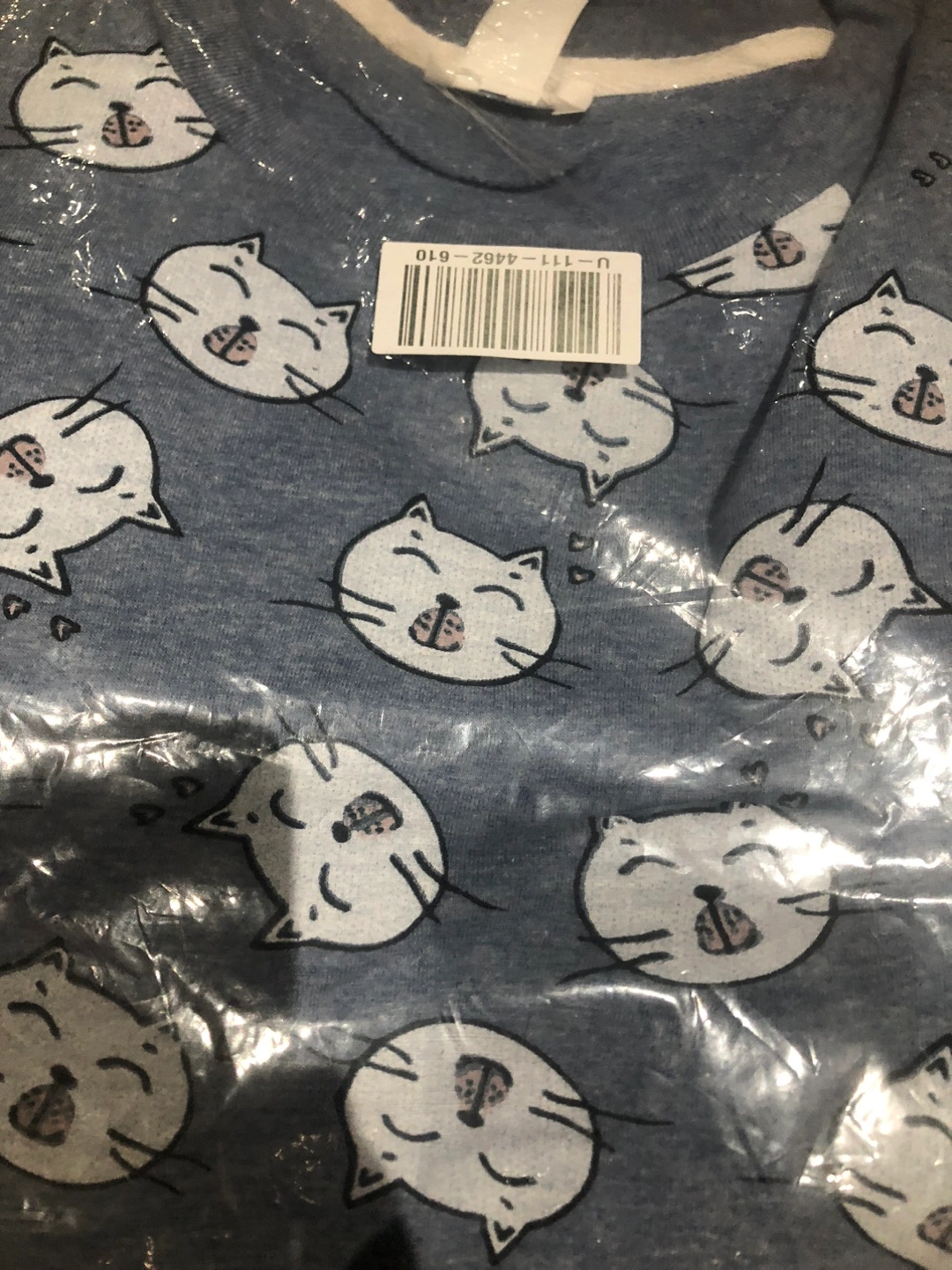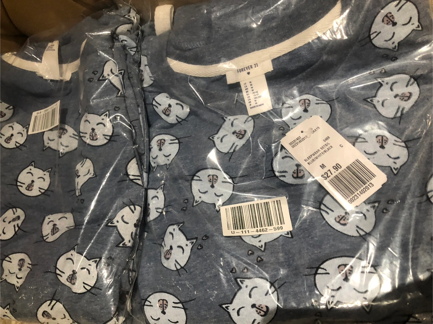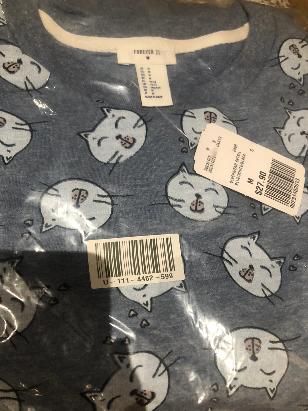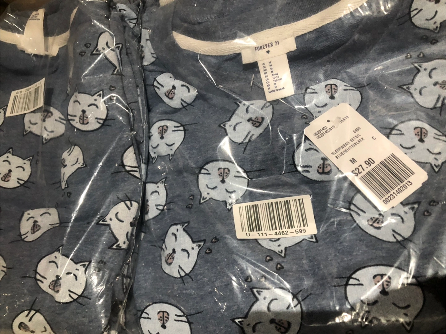 The sleepwear set comes with an adorable cat print, and is in the original packaging. Perfect for a peaceful sleep.