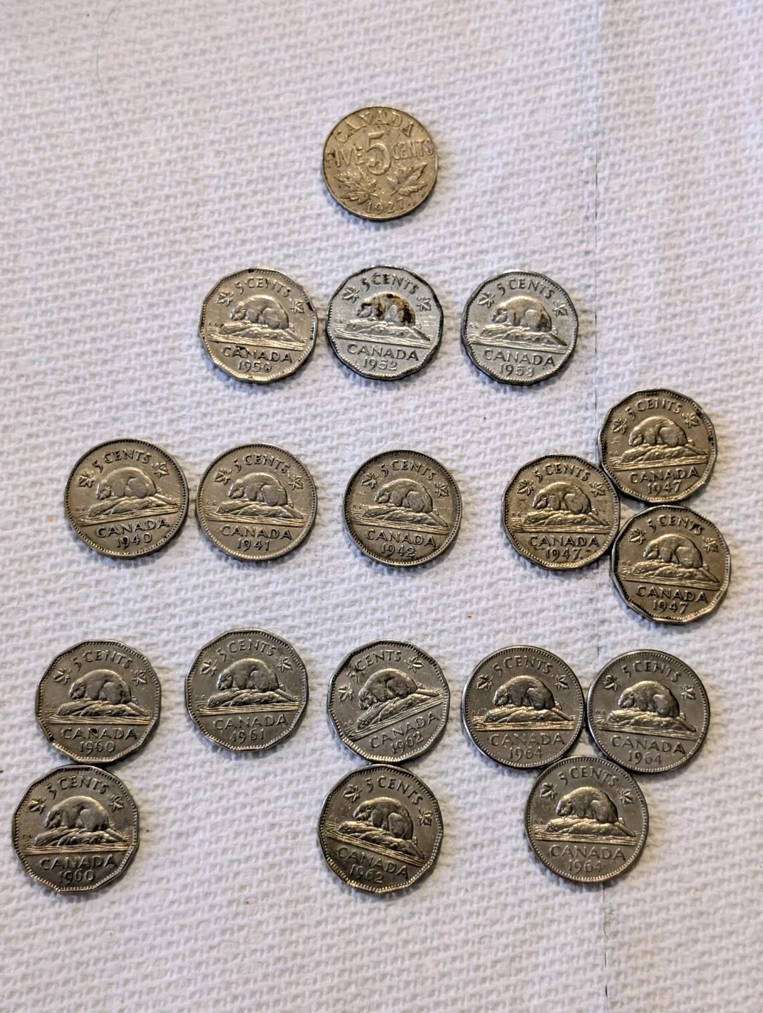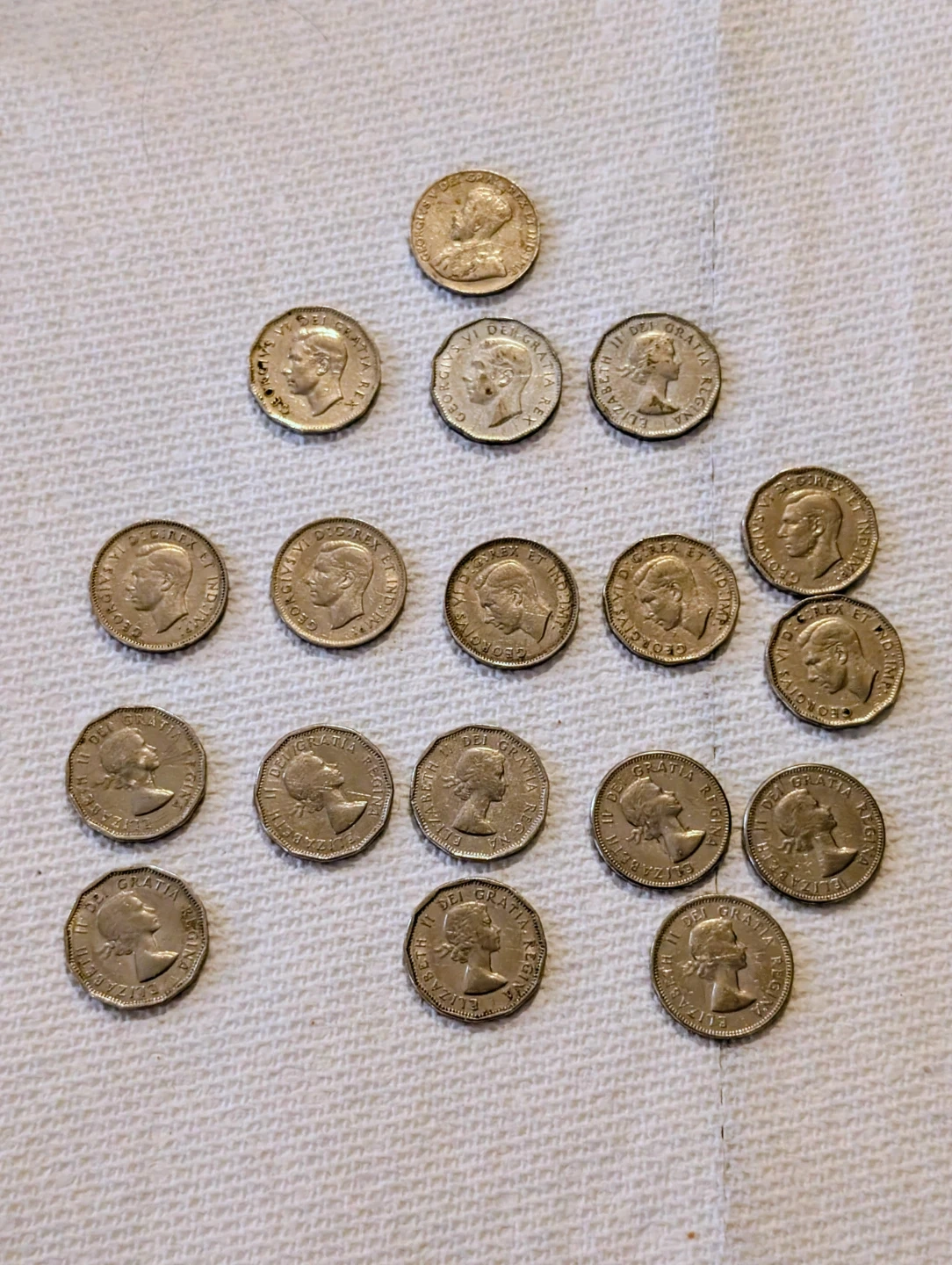 A collection of 18 Canadian 5-cent coins. Some feature King George VI and others Queen Elizabeth II. Dates range from 1927 to 1964. A great starter set or addition to any collection