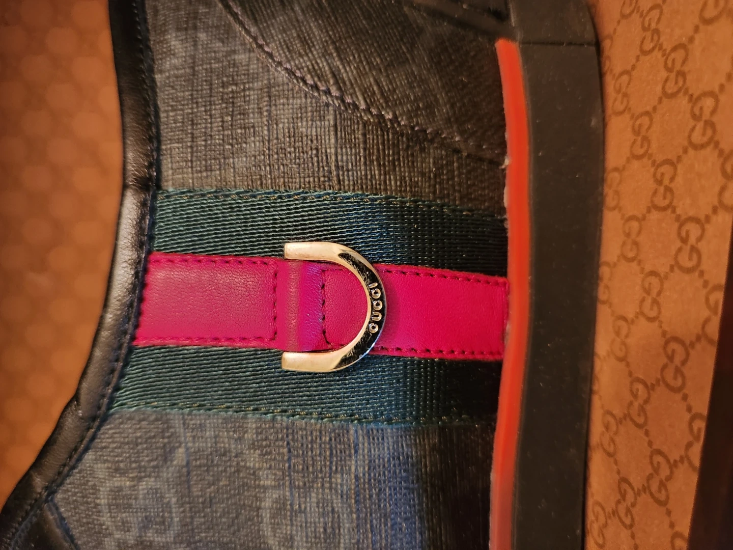 These are a pair of black Gucci sneakers featuring the signature GG canvas. They have the iconic green and red web stripe with a D-ring detail. Includes original box. These kicks are super stylish!