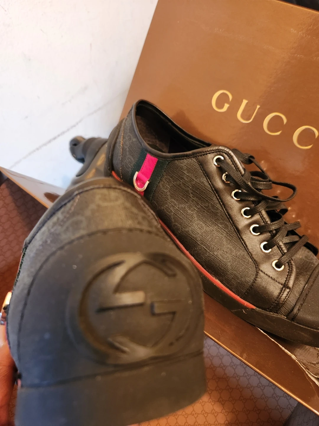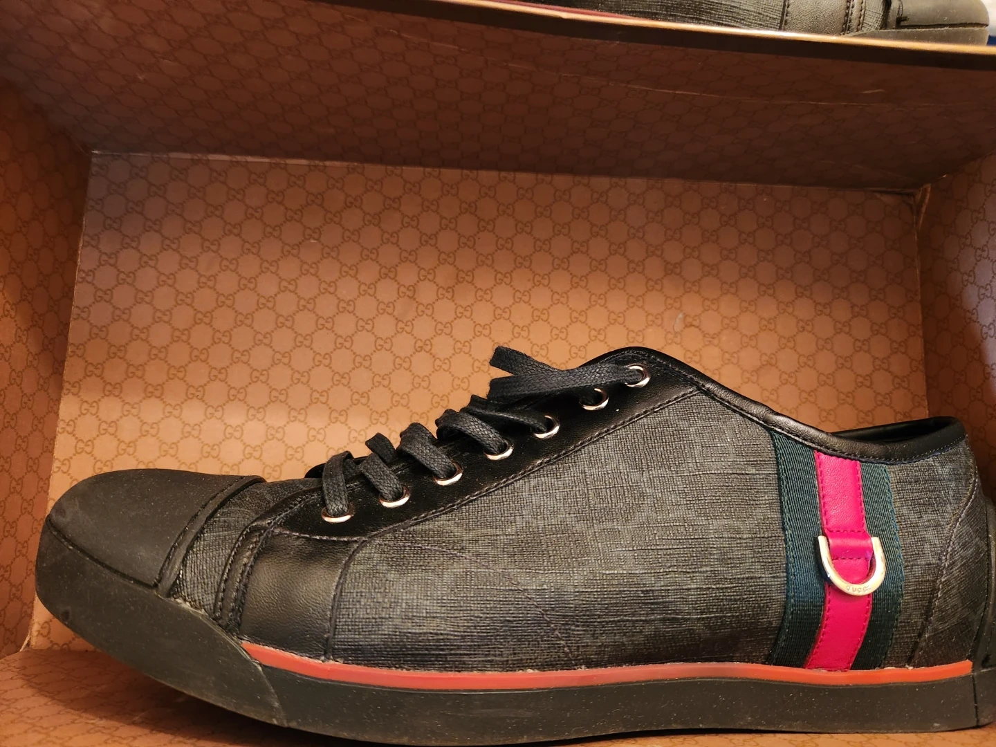 These are a pair of black Gucci sneakers featuring the signature GG canvas. They have the iconic green and red web stripe with a D-ring detail. Includes original box. These kicks are super stylish!