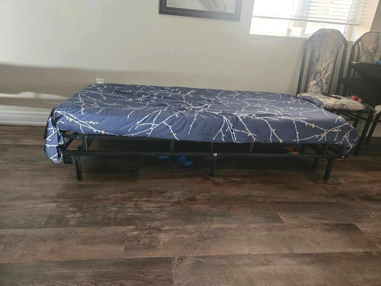 This is a foldable twin bed frame with a mattress. It features a dark blue mattress cover with a white branch design. The frame is made of metal and folds for easy storage. It's a convenient option for guest rooms or small spaces. This bed is useful for accommodating overnight guests or for temporary sleeping arrangements.