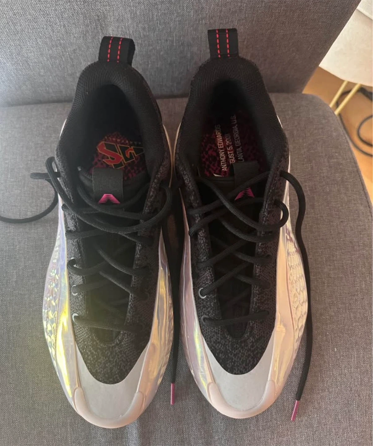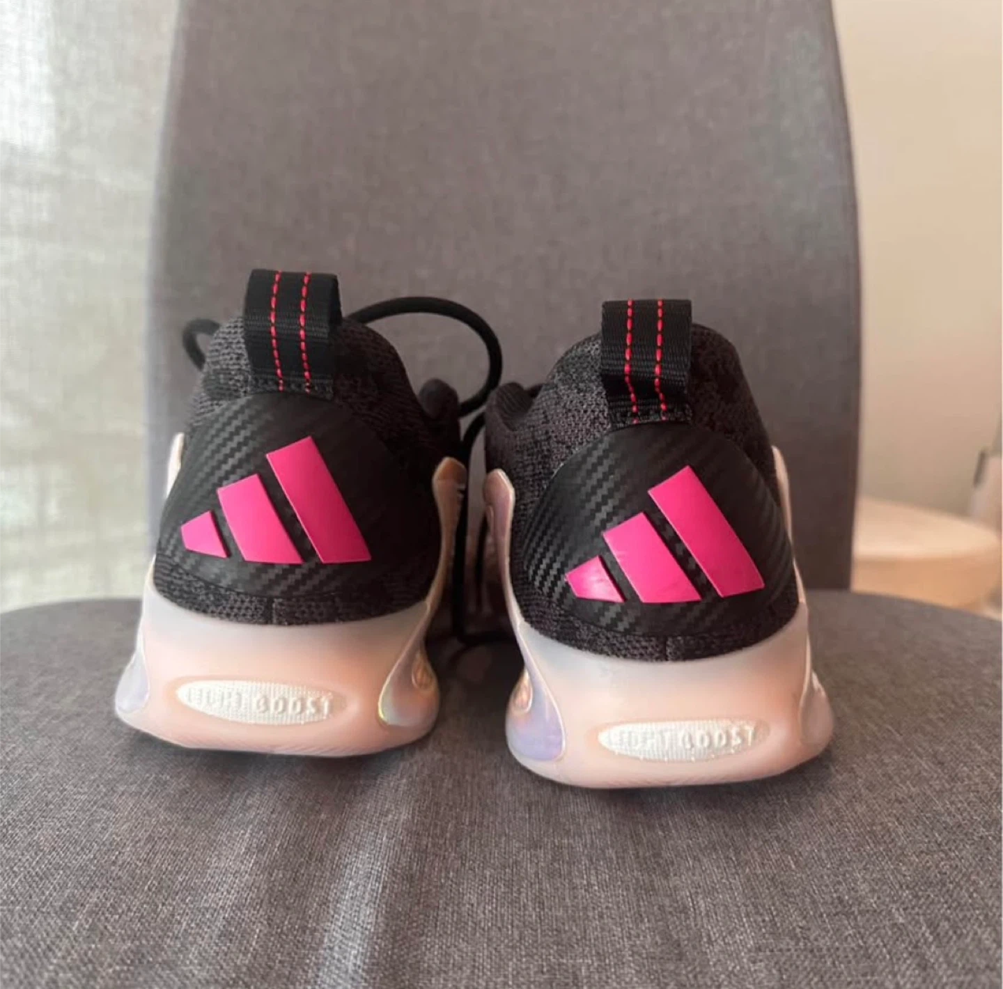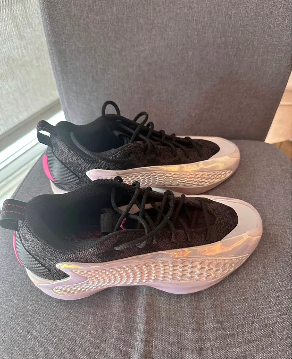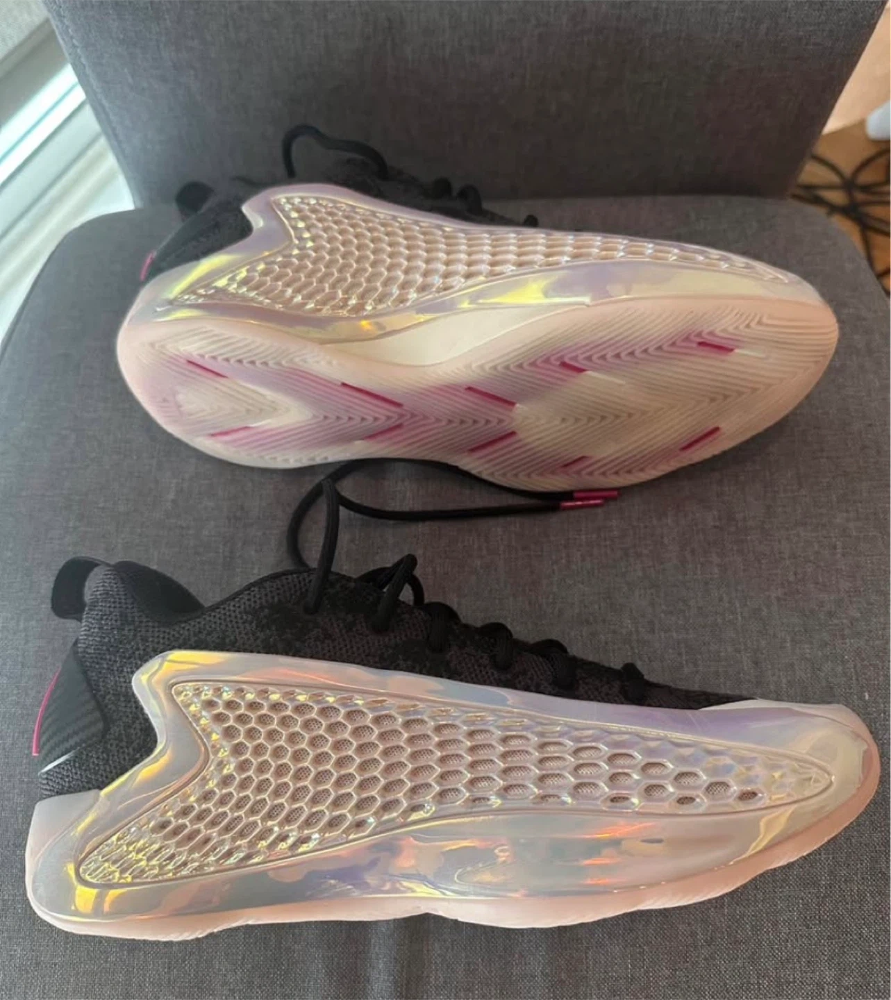 These Adidas basketball shoes feature ae 1 sole for excellent cushioning. They have a black knit upper with iridescent detailing and pink accents. The outsole shows a dynamic tread pattern.