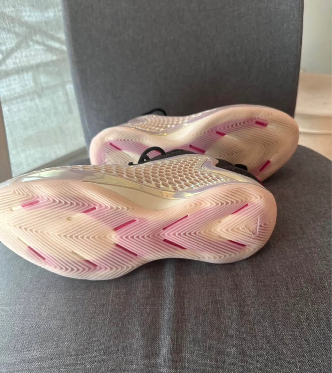 These Adidas basketball shoes feature ae 1 sole for excellent cushioning. They have a black knit upper with iridescent detailing and pink accents. The outsole shows a dynamic tread pattern.