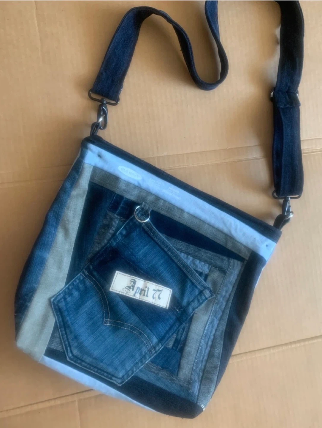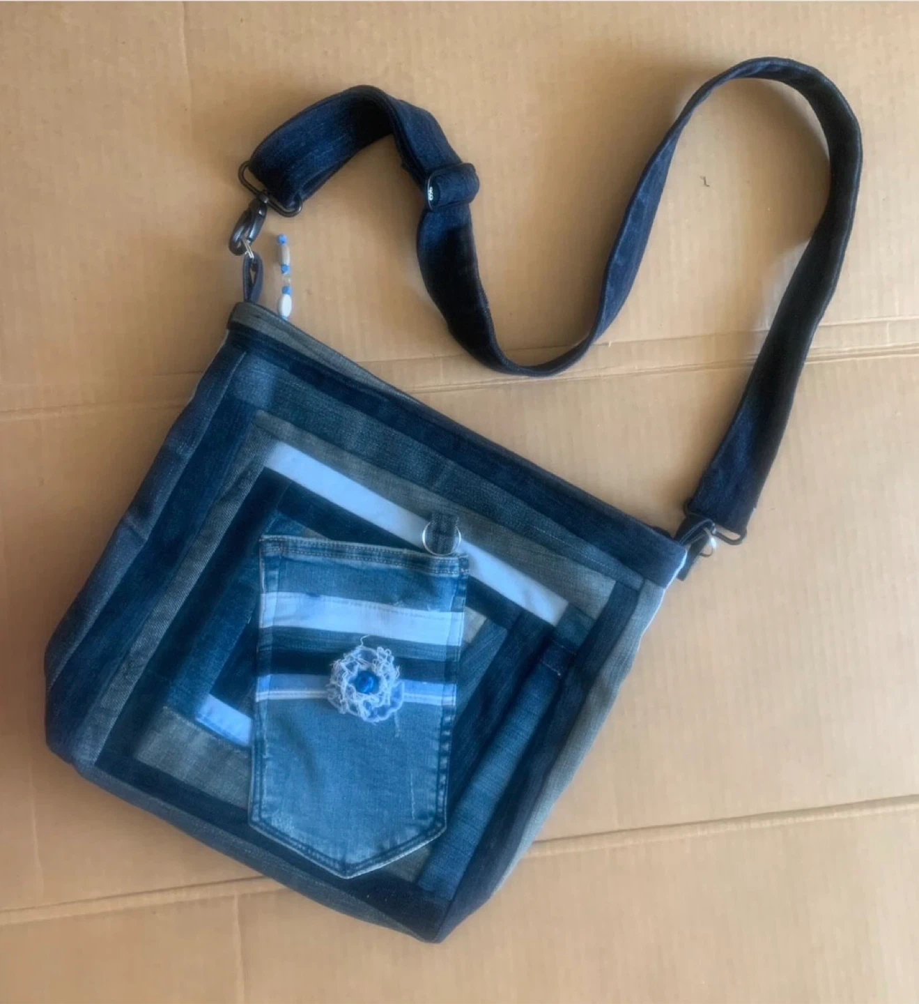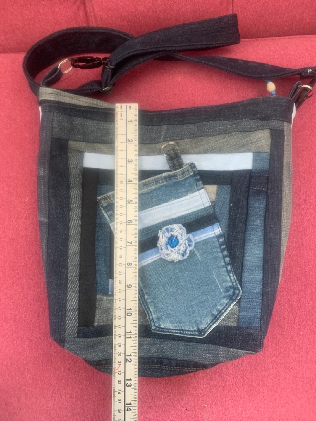 This unique one of a kind shoulder bag is crafted from various denim washes. It features a front pocket with a decorative blue flower accent and is big enough to accommodate your phone.