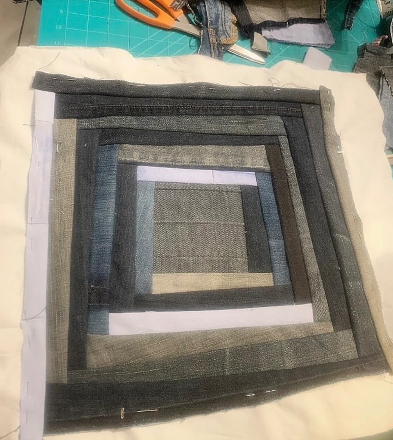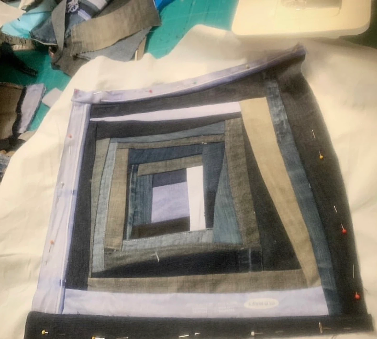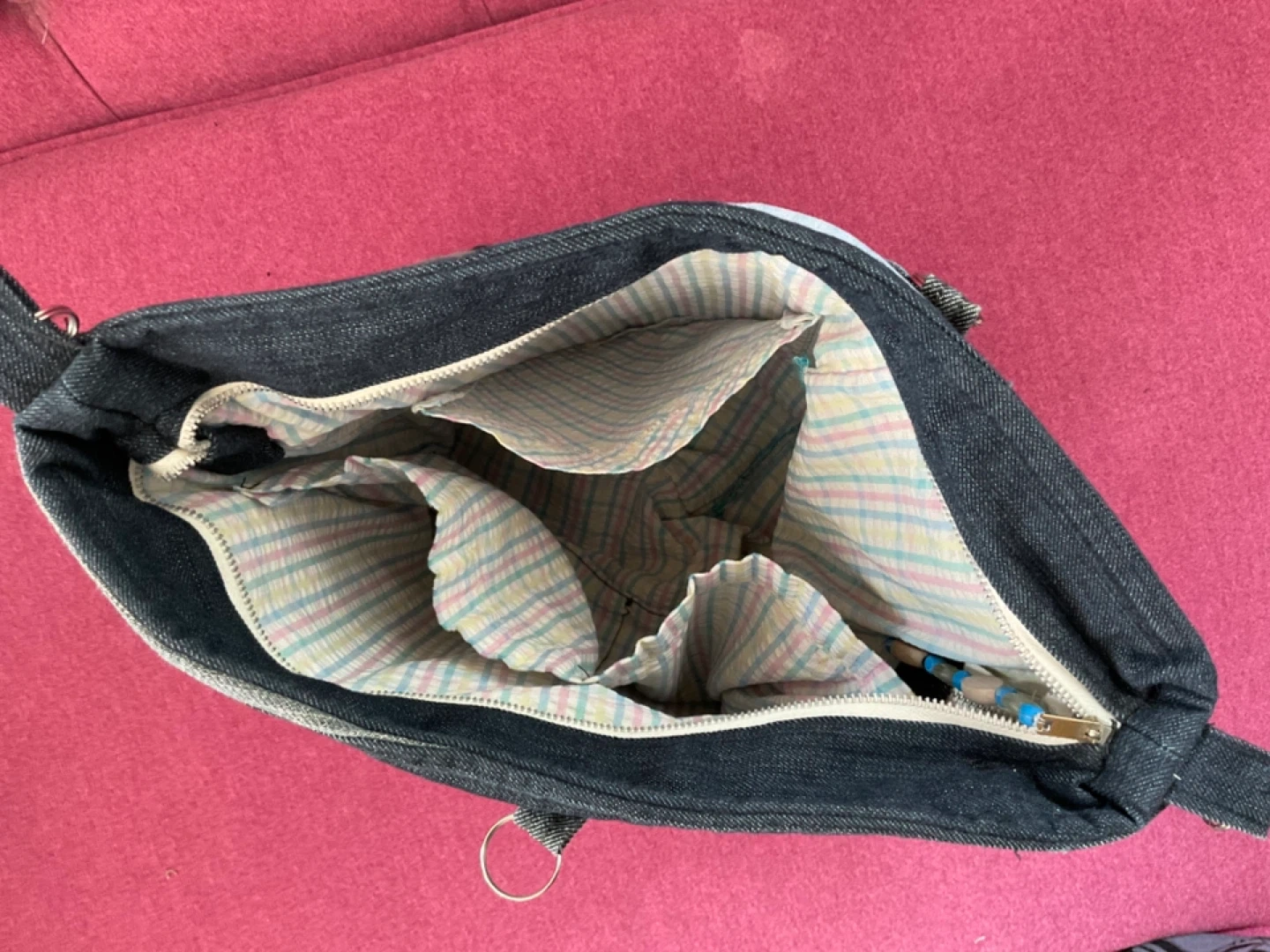 This unique one of a kind shoulder bag is crafted from various denim washes. It features a front pocket with a decorative blue flower accent and is big enough to accommodate your phone.