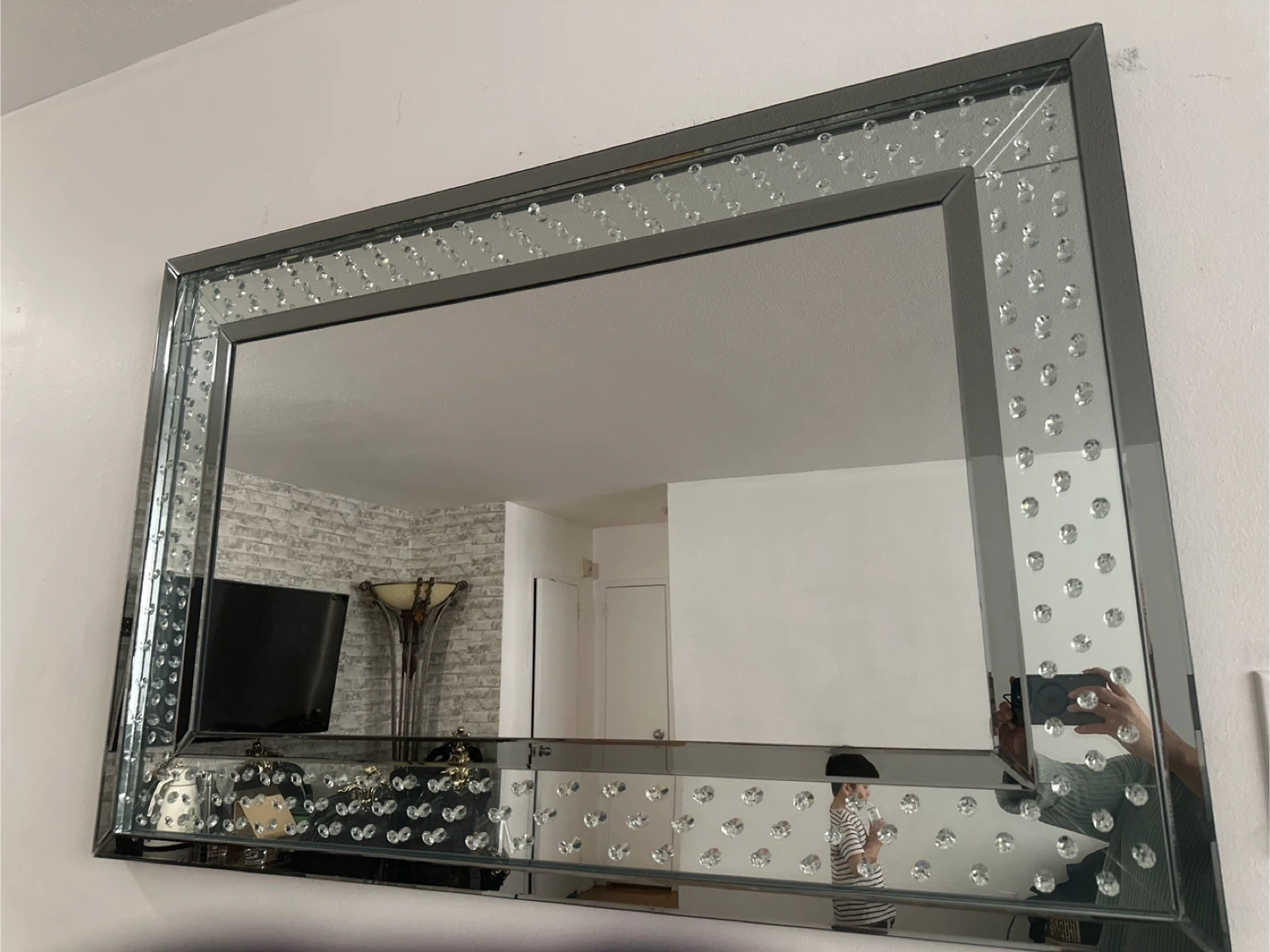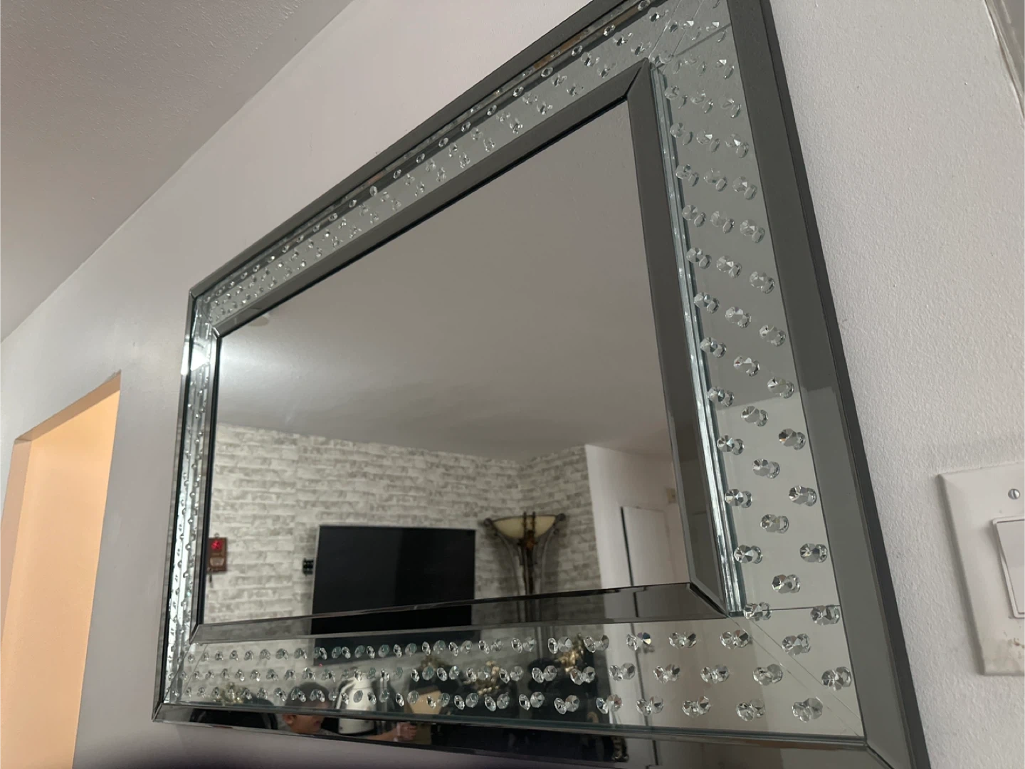 A stylish rectangular wall mirror featuring a dark grey frame embellished with clear crystal accents. This decorative piece will add a touch of glamour to any room. Its reflective surface makes spaces feel larger and brighter.