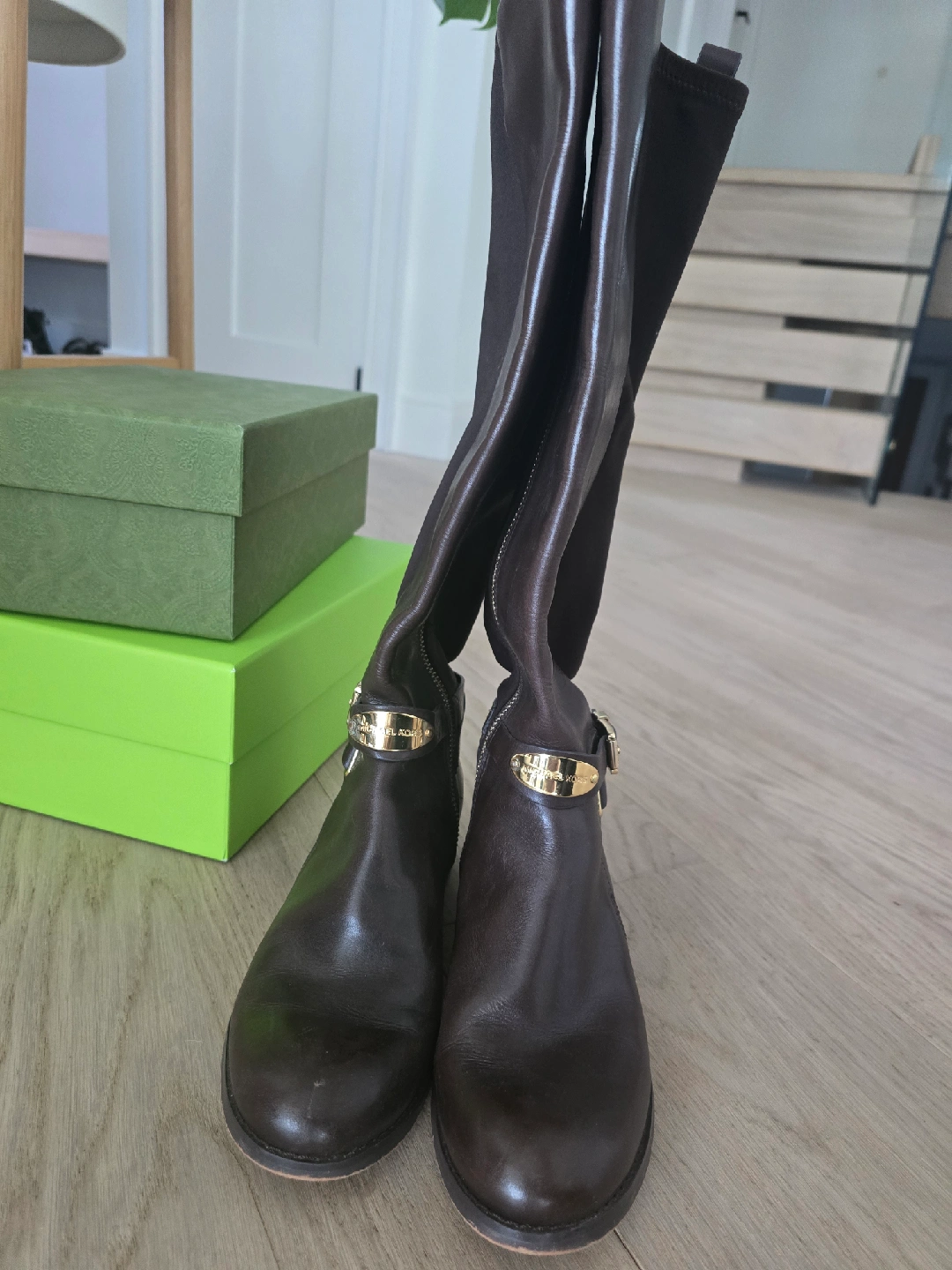 These Michael Kors knee-high boots are a stylish addition to any wardrobe! They are a size 6M and feature a sleek brown leather design with a comfortable fit. Perfect for dressing up or down!