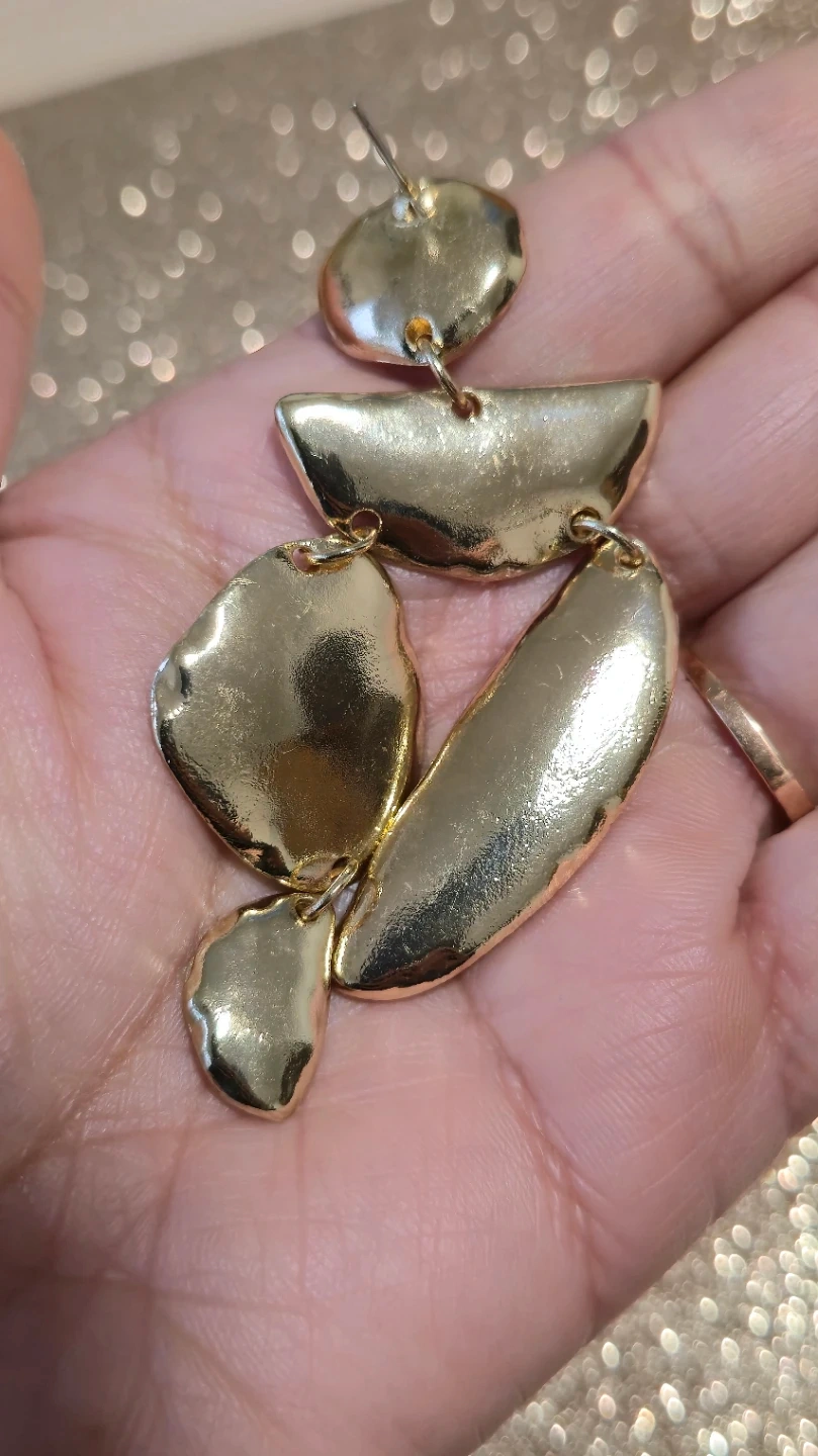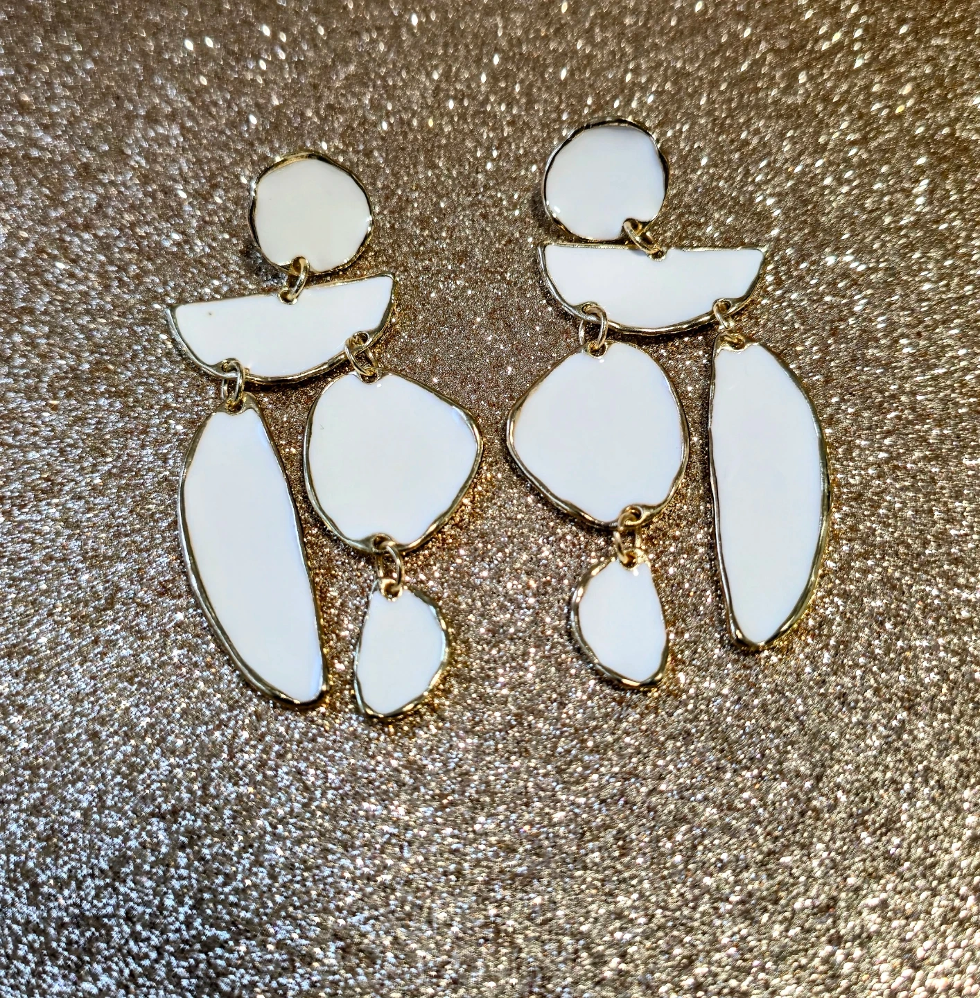 Stylish geometric dangle earrings with a mix of shapes. Gold-tone metal with white enamel inlay. These earrings offer a unique, artistic look.