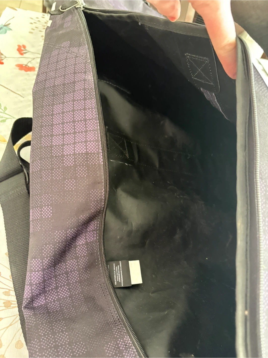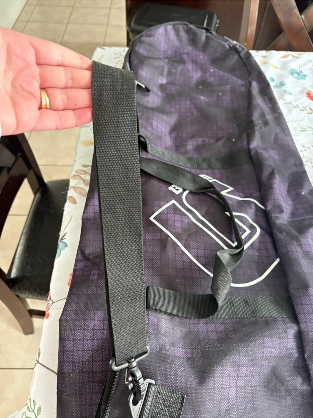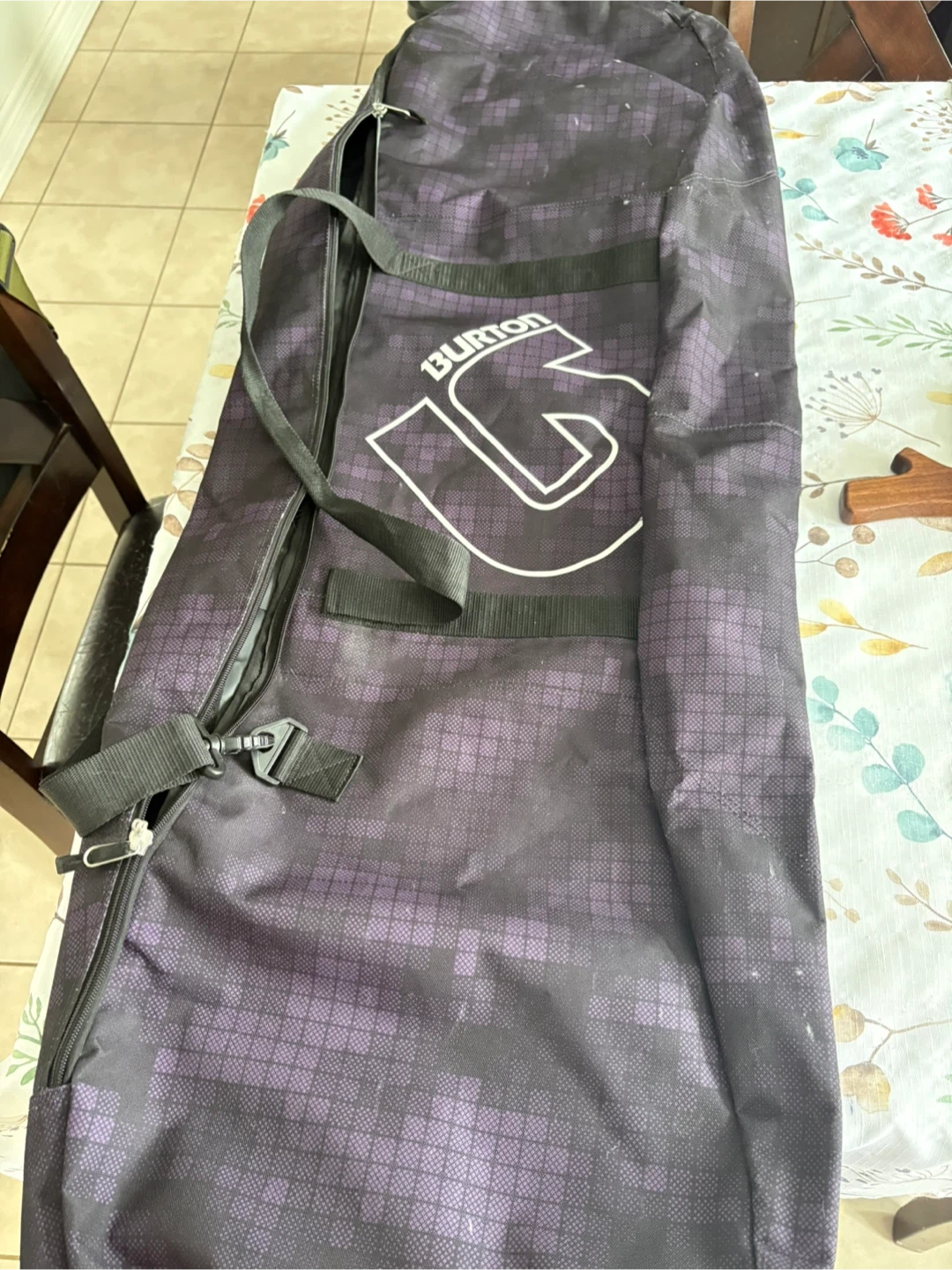 This is a Burton snowboard bag. It's purple with a black grid pattern and features a large main compartment and shoulder strap. It's designed to carry a snowboard and related gear.