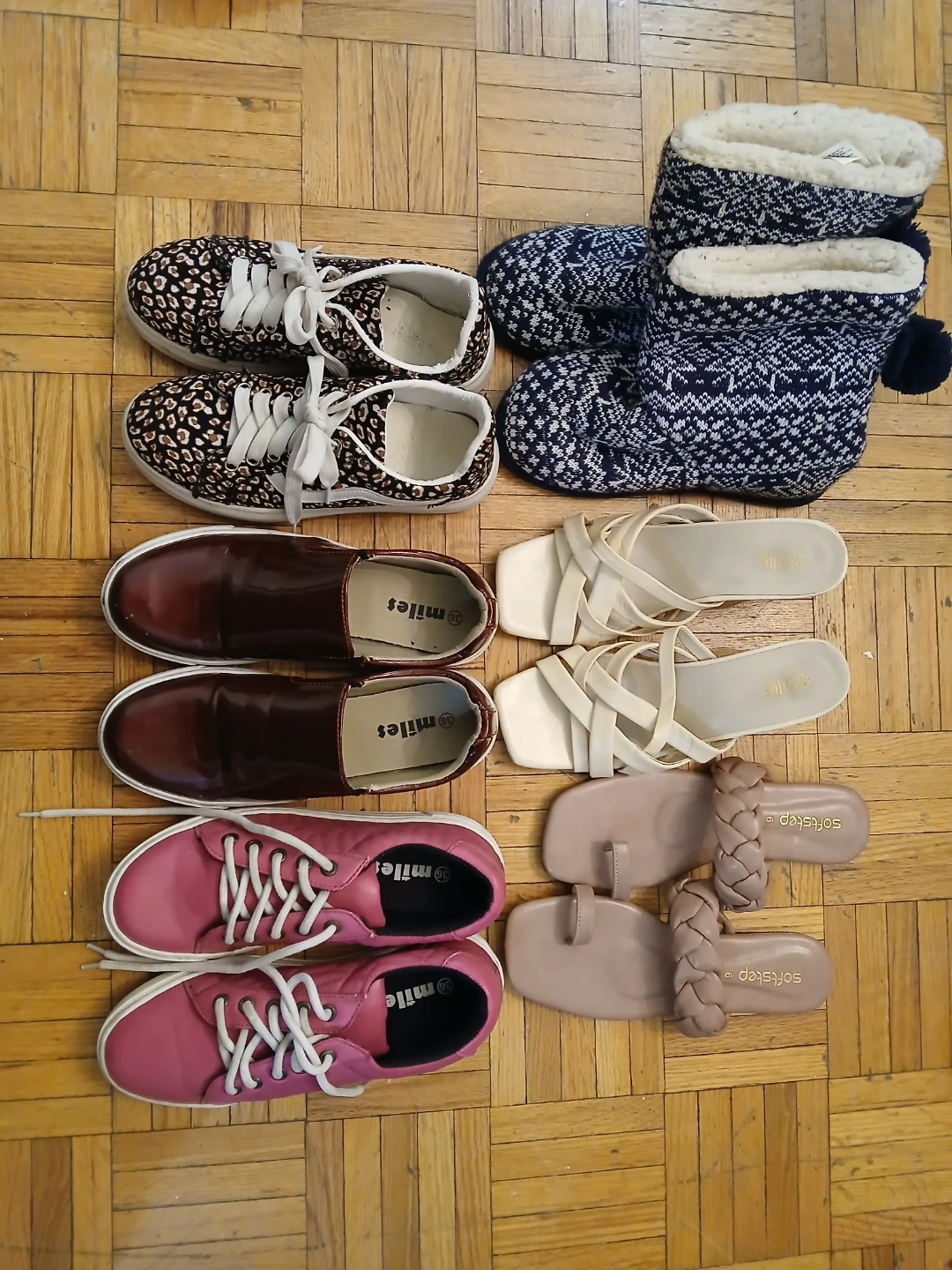 Includes a pair of patterned low-top sneakers, two pairs of casual slip-on shoes, and a pair of pink sneakers. Also includes a pair of cream strappy sandals and beige slide sandals with braided detail. Additionally, a pair of cozy knit slipper boots with fleece lining.