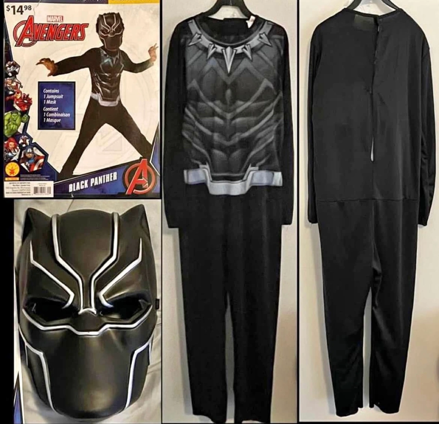 Selling a Marvel Avengers Black Panther costume! It includes a jumpsuit and a mask to complete the look. Perfect for dress-up or Halloween!