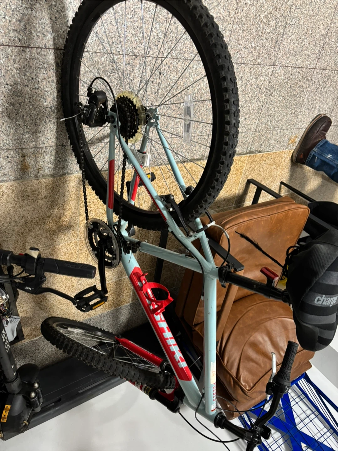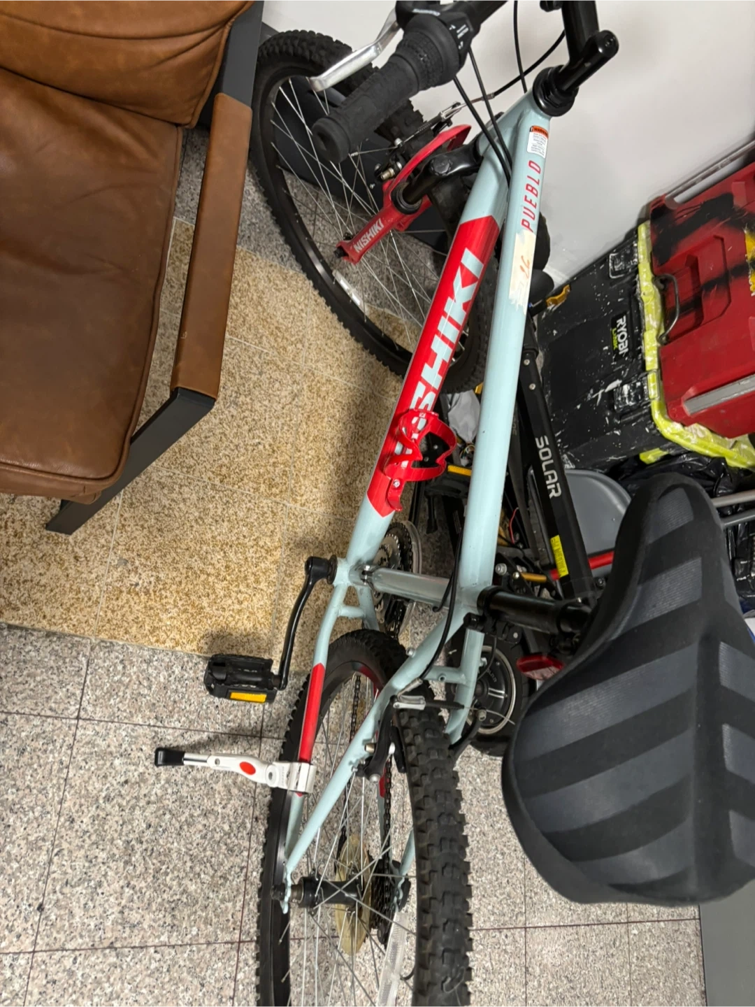 This is a SHIKI Pueblo mountain bike. It features a light blue frame with red accents. The bike has knobby tires suitable for off-road use. It's a great option for trails or casual riding!